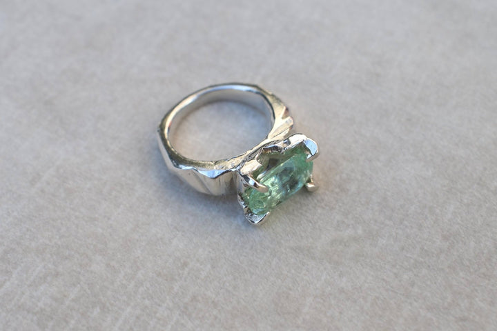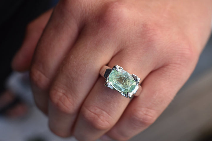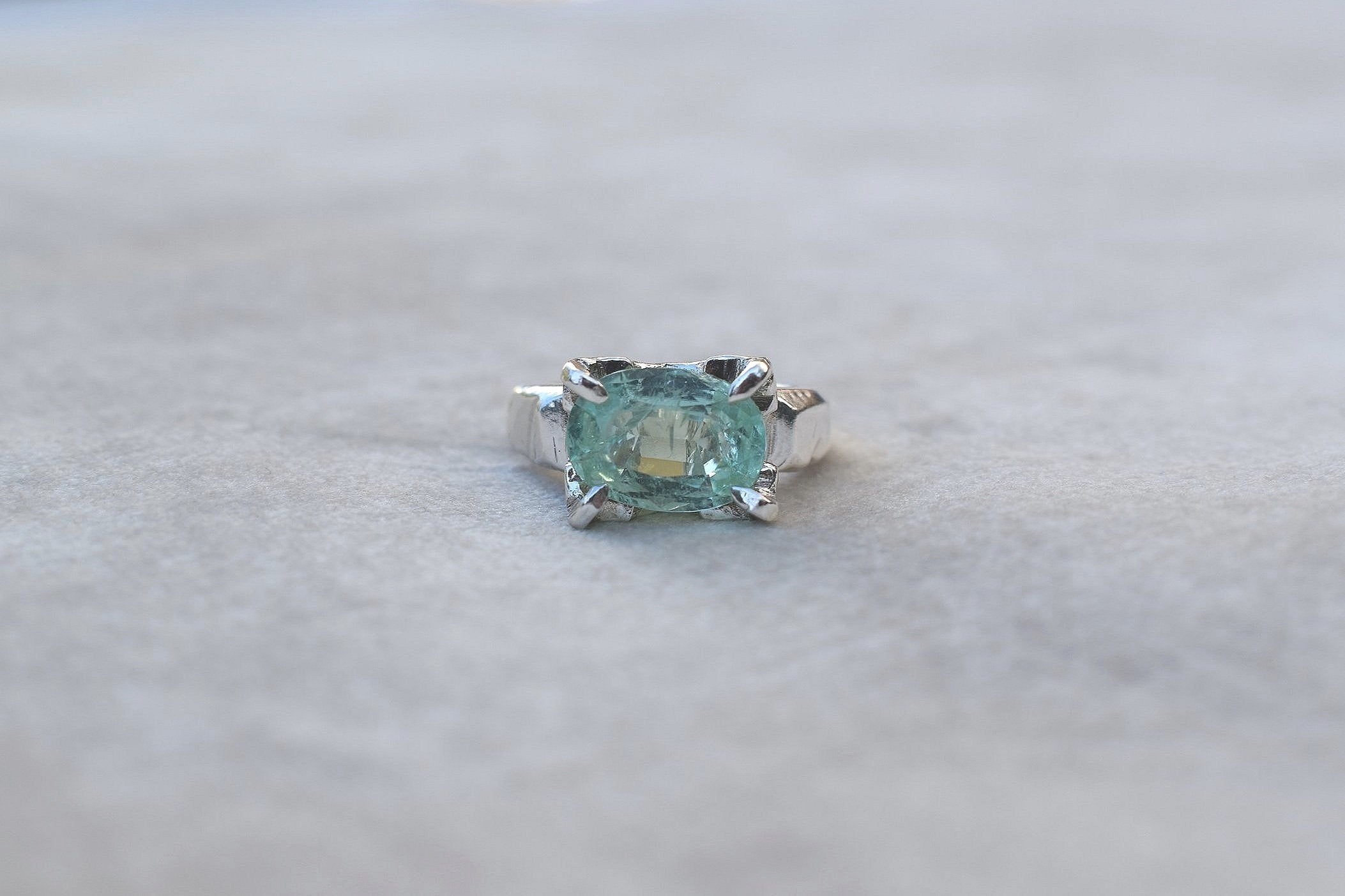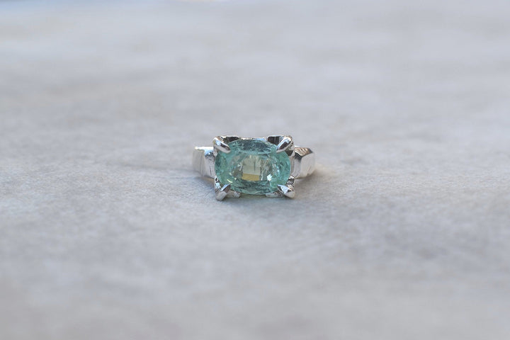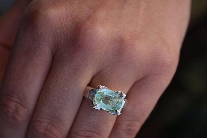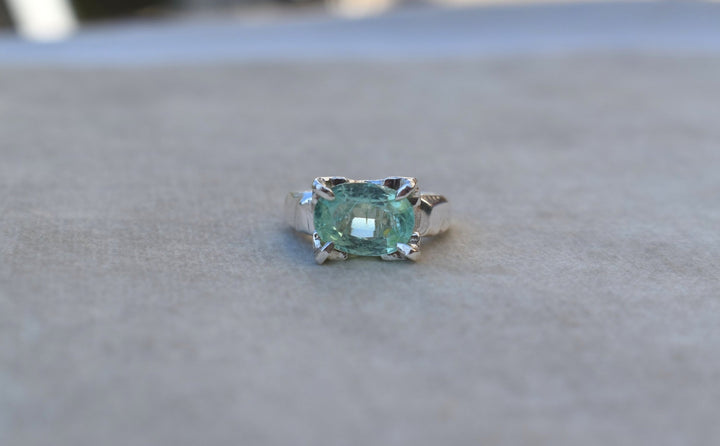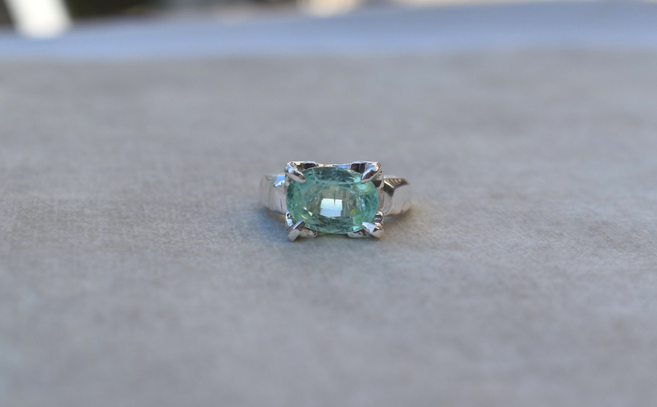 A beautiful, one of a kind, sea foam green tourmaline stone set in a silver claw setting. This shade of sparkling tourmaline is rarer than diamond.