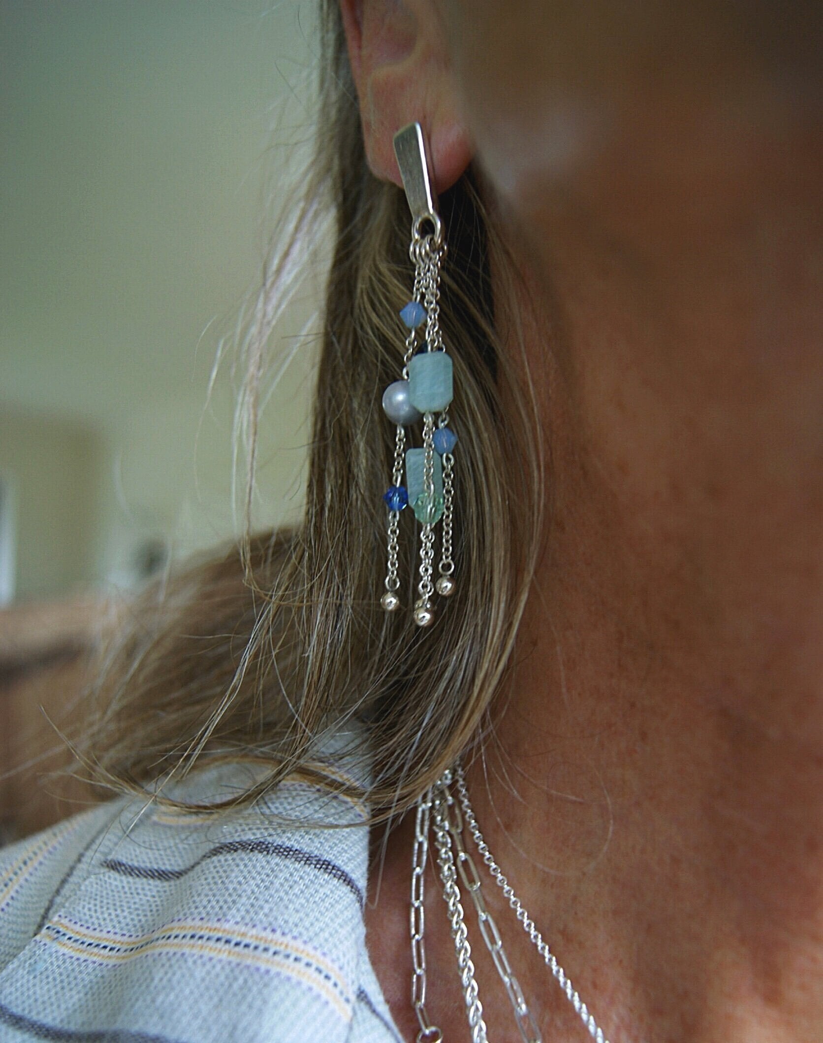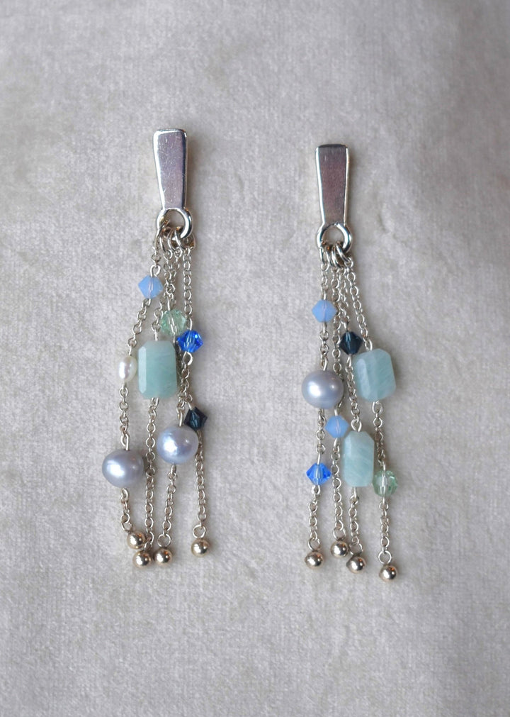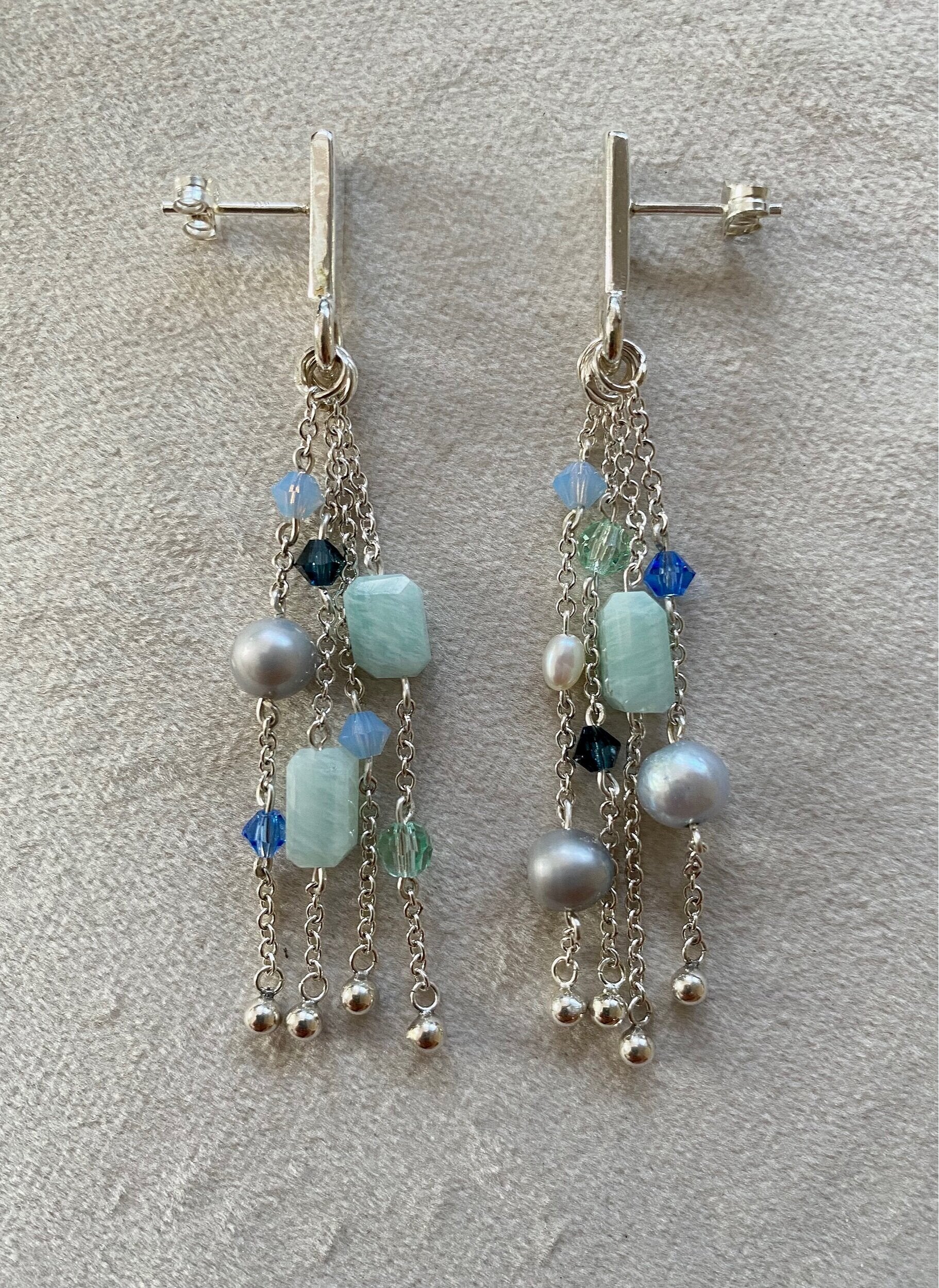 Beautiful dangle charm earrings with freshwater pearls, tiny glass beads and semi precious nugget beads. Each earring is made with unique stones and beads and will not be an exact replica.