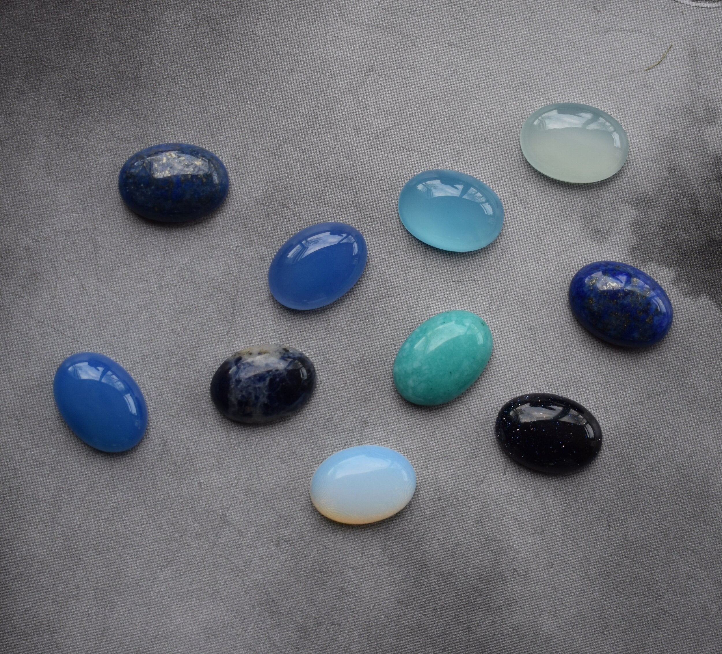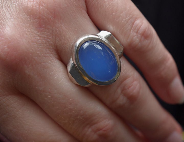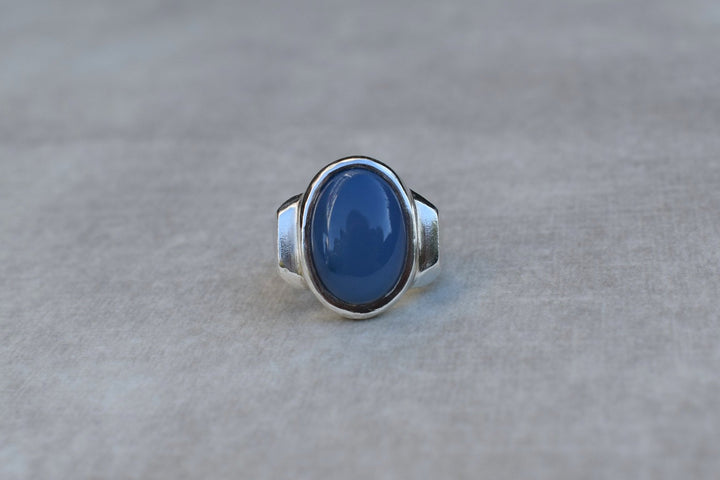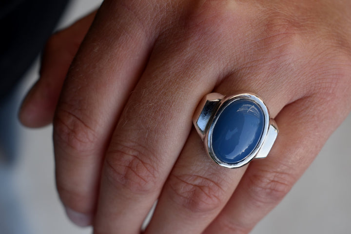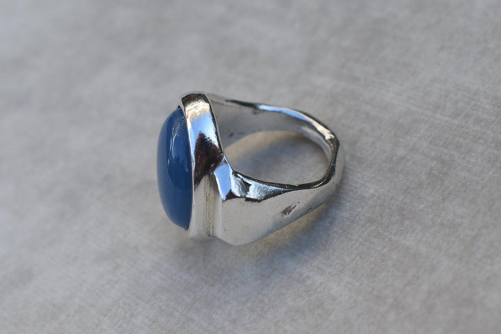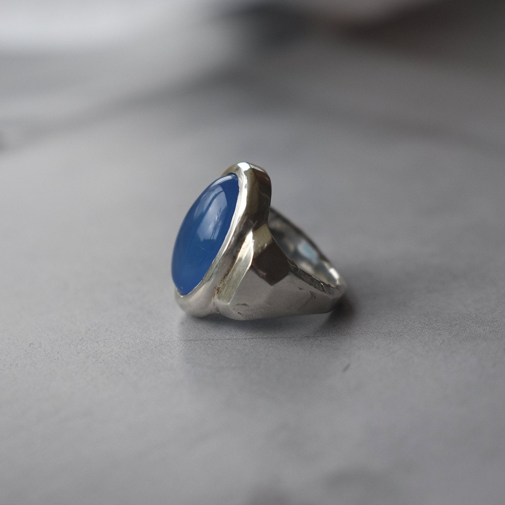 Transparent Blue agate cabochon set in a thick solid silver ring.