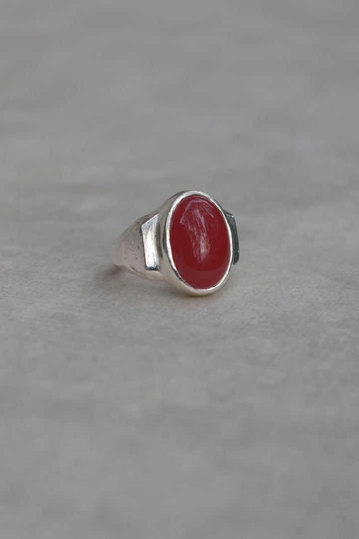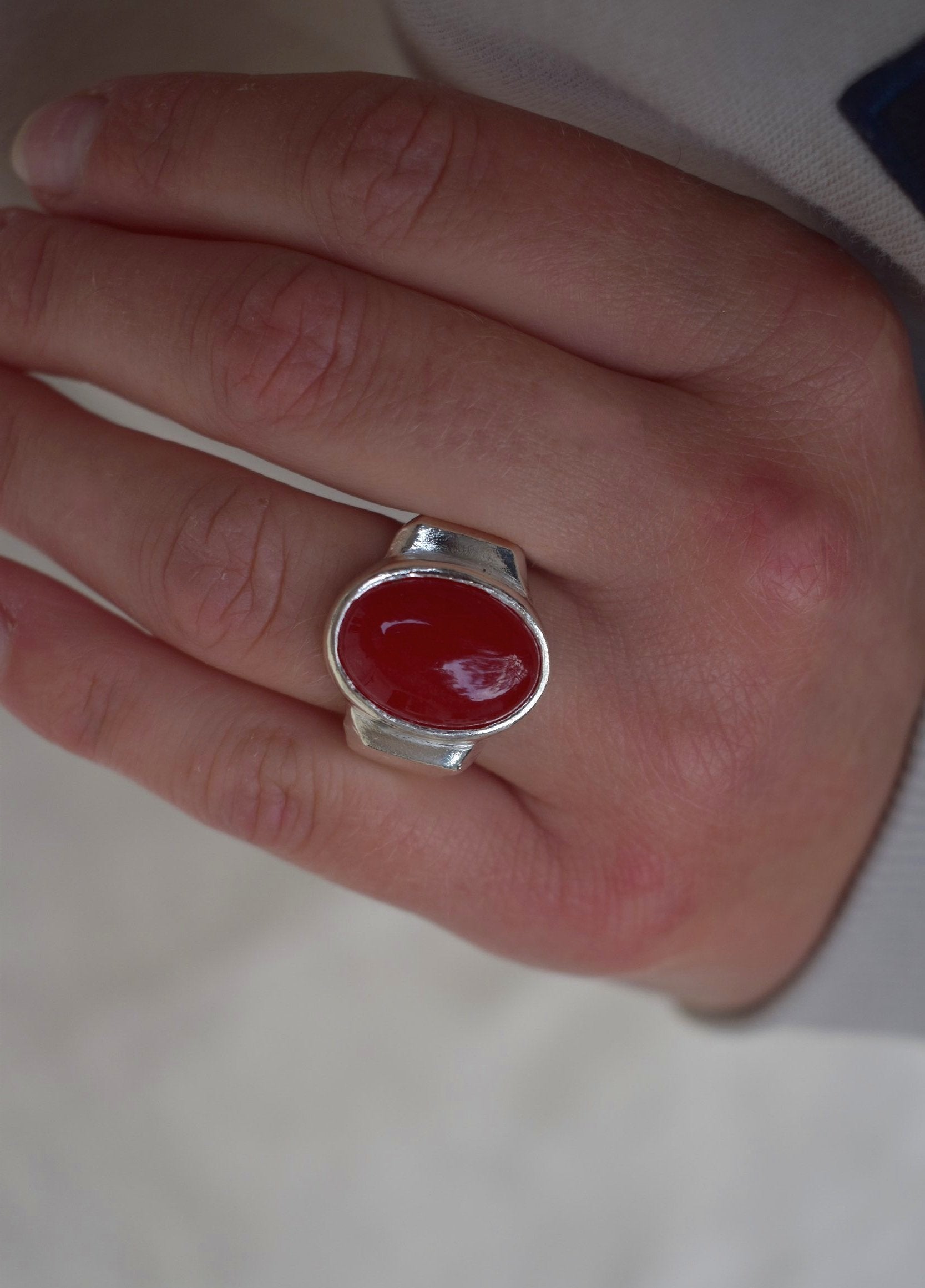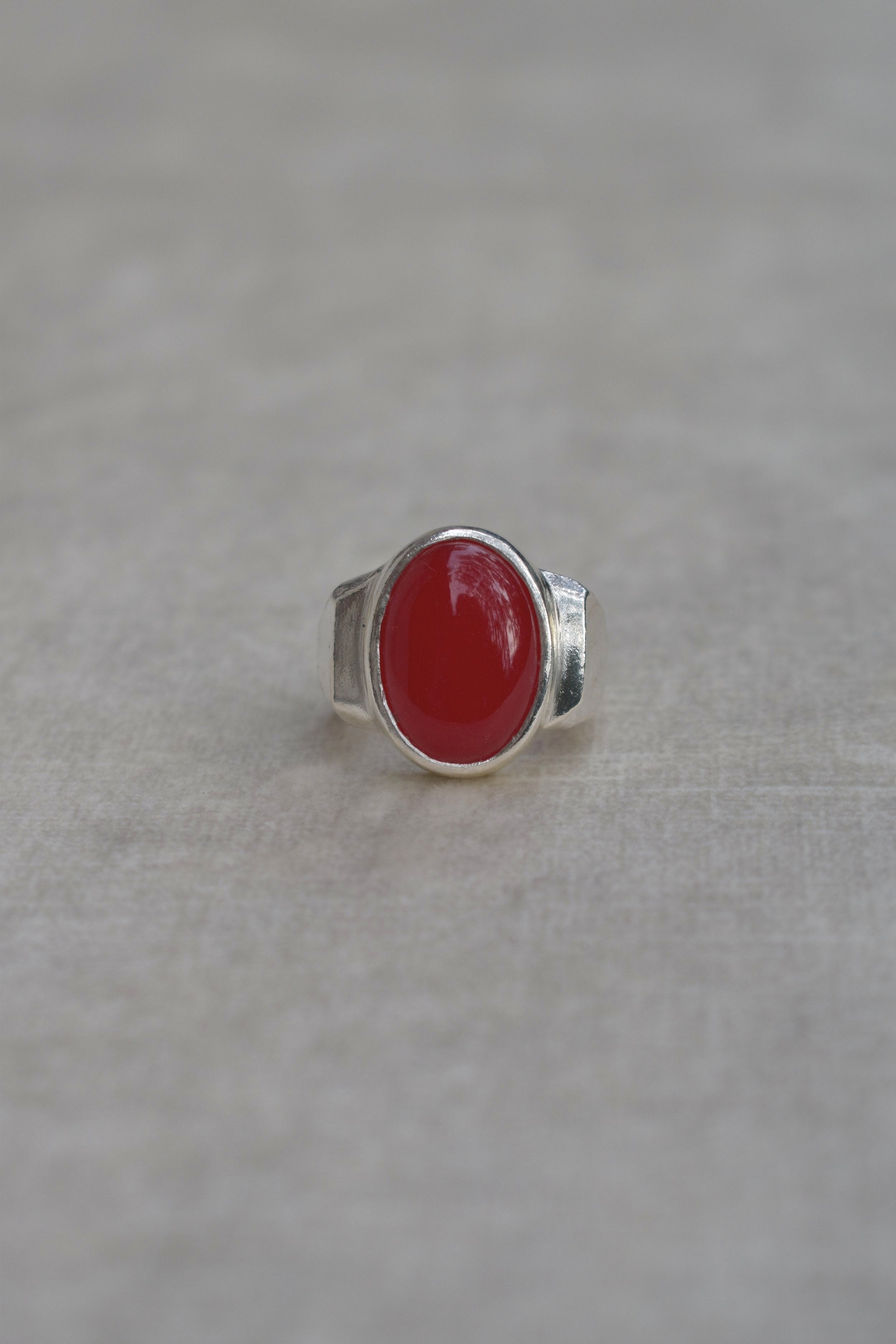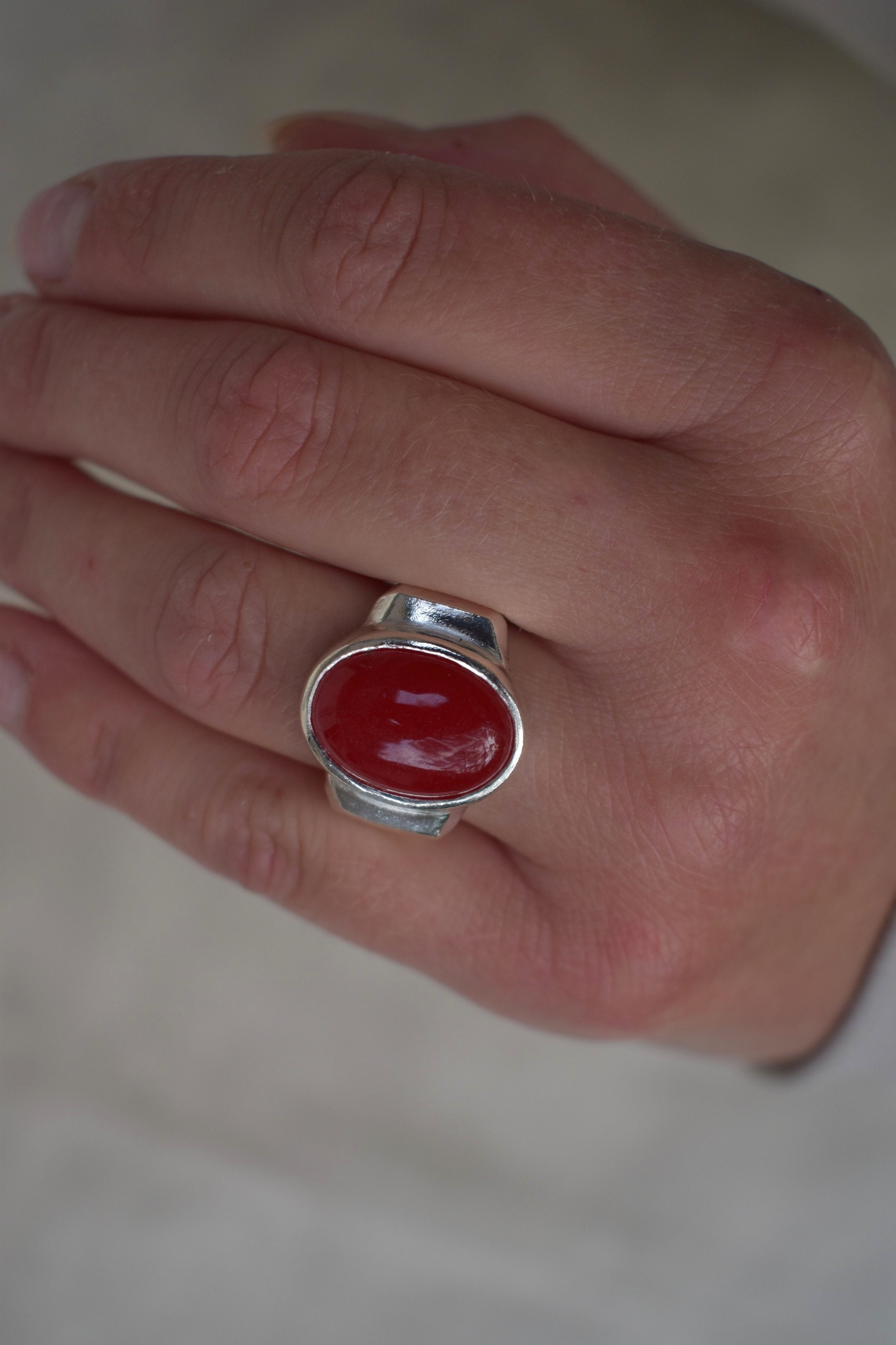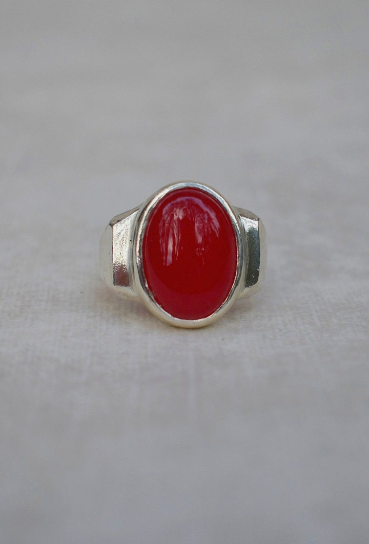 Beautiful red agate cabochon set in a thick solid silver ring.
