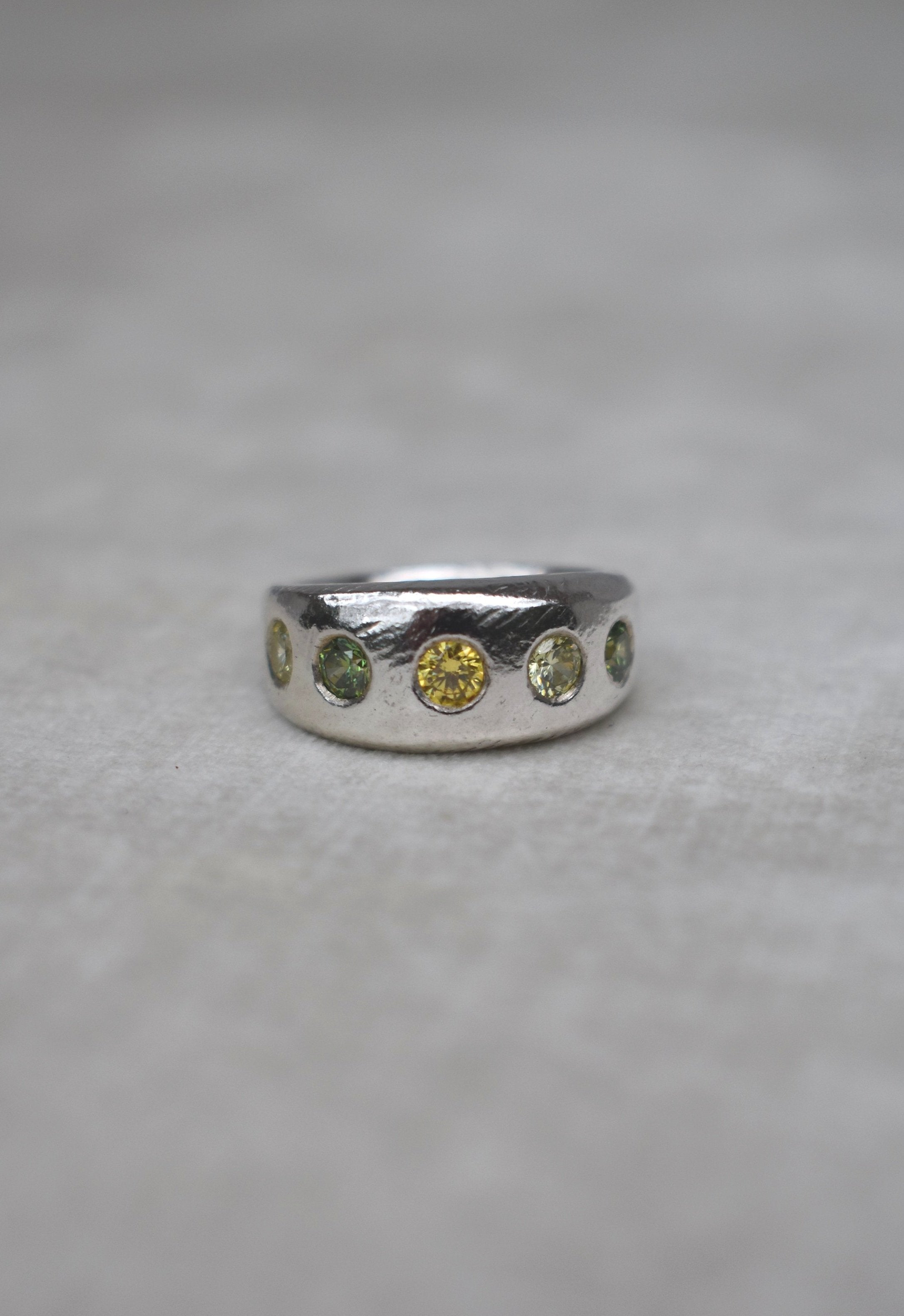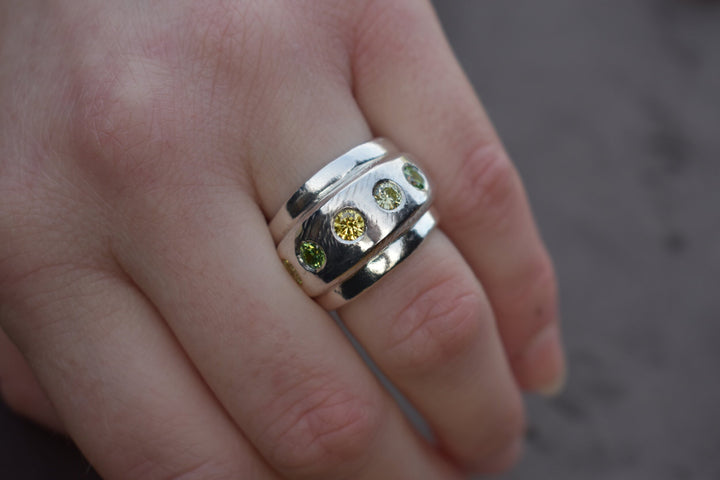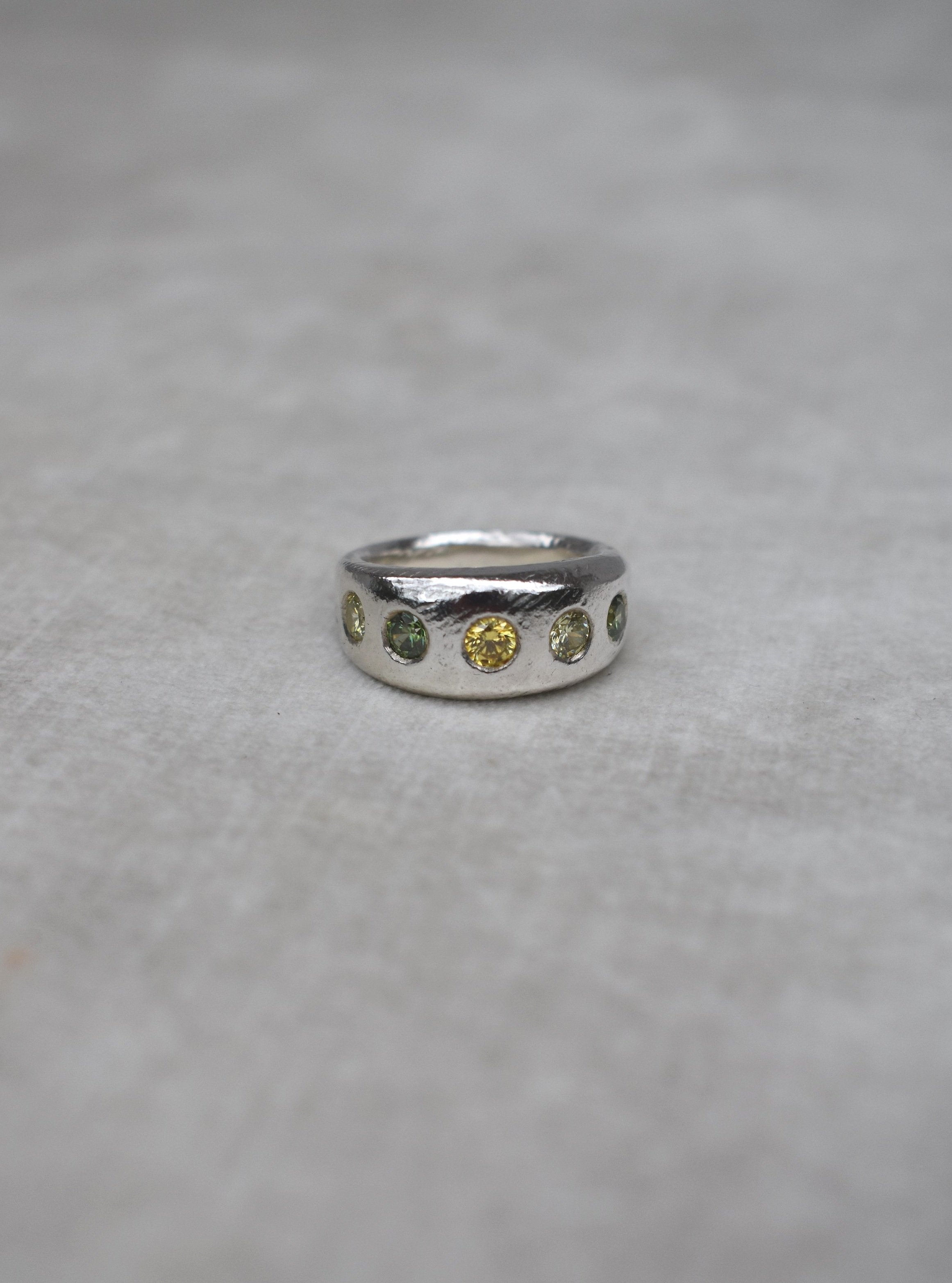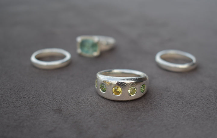 This is a thick solid hand carved band with 5 sparkling stones set around. This ring is made from 100% recycled silver. Stone colours and sizes can be customised.