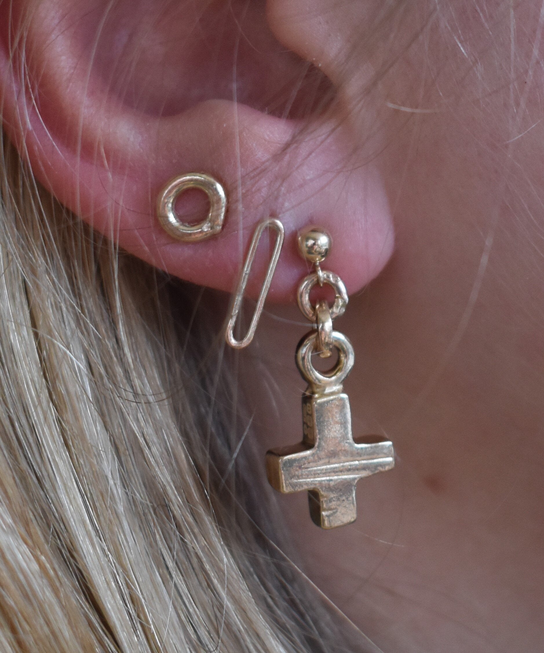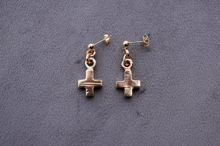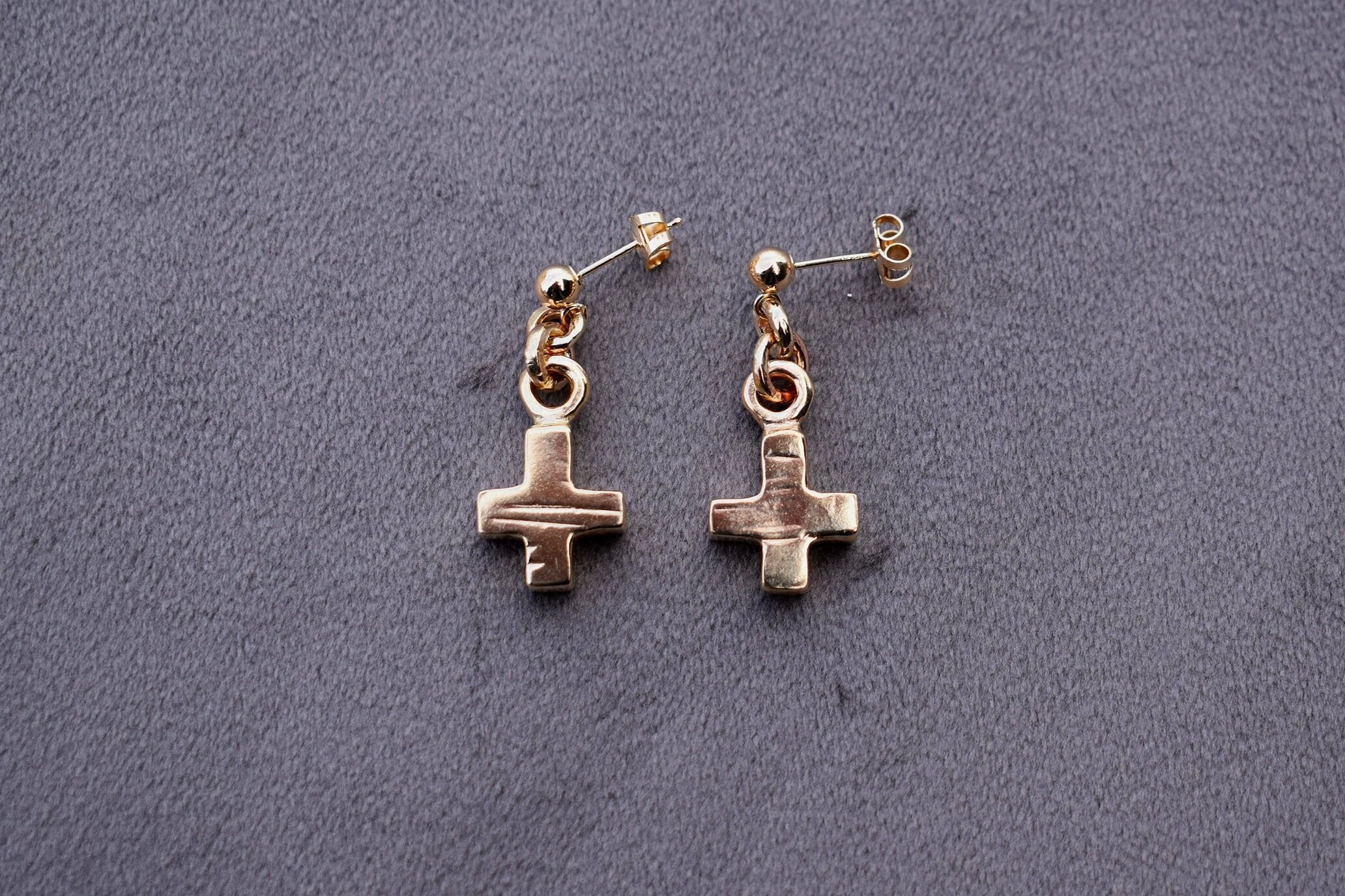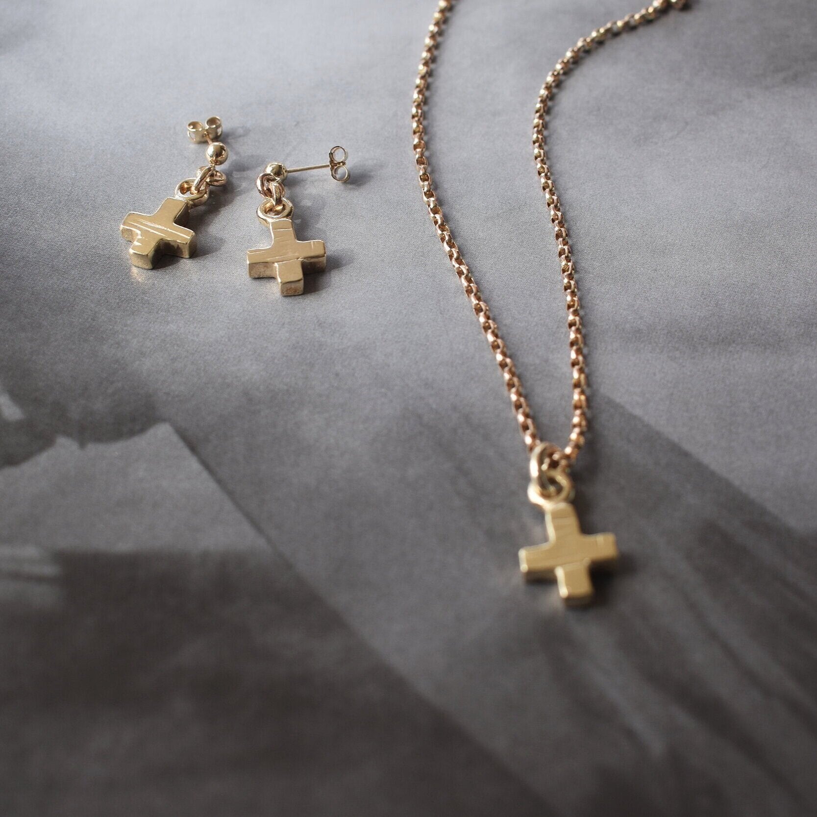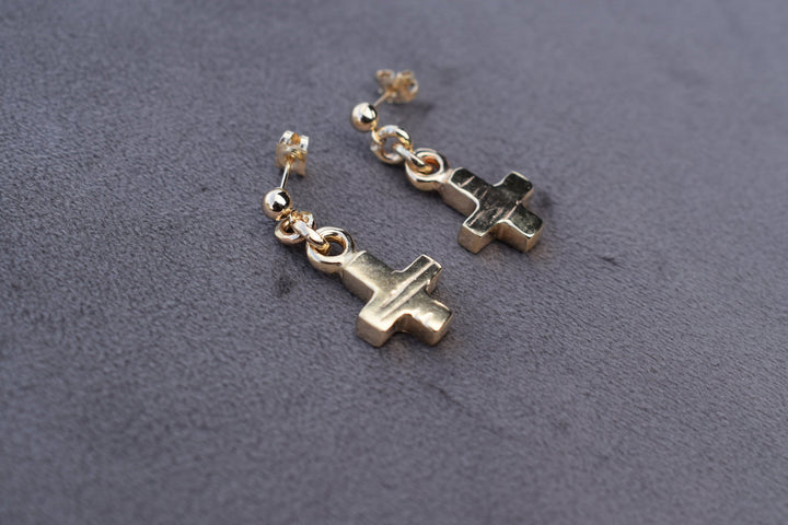 Hand carved 9ct yellow gold baby crosses dropping on ball studs. Hallmarked for gold and with Tanicia’s individual makers mark. Approx 4cm long.