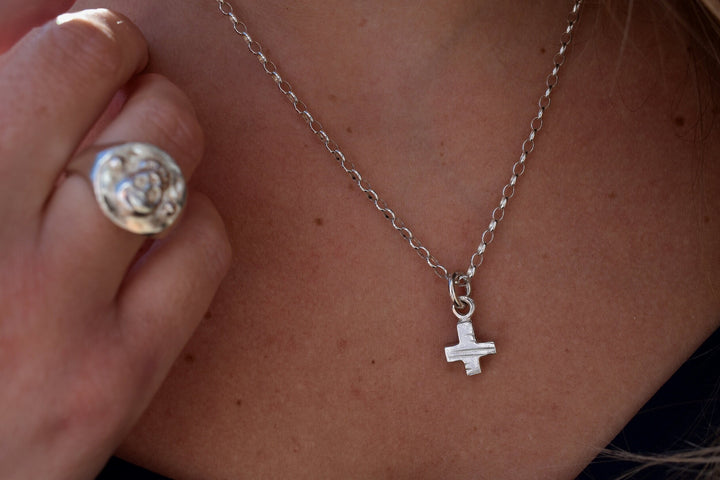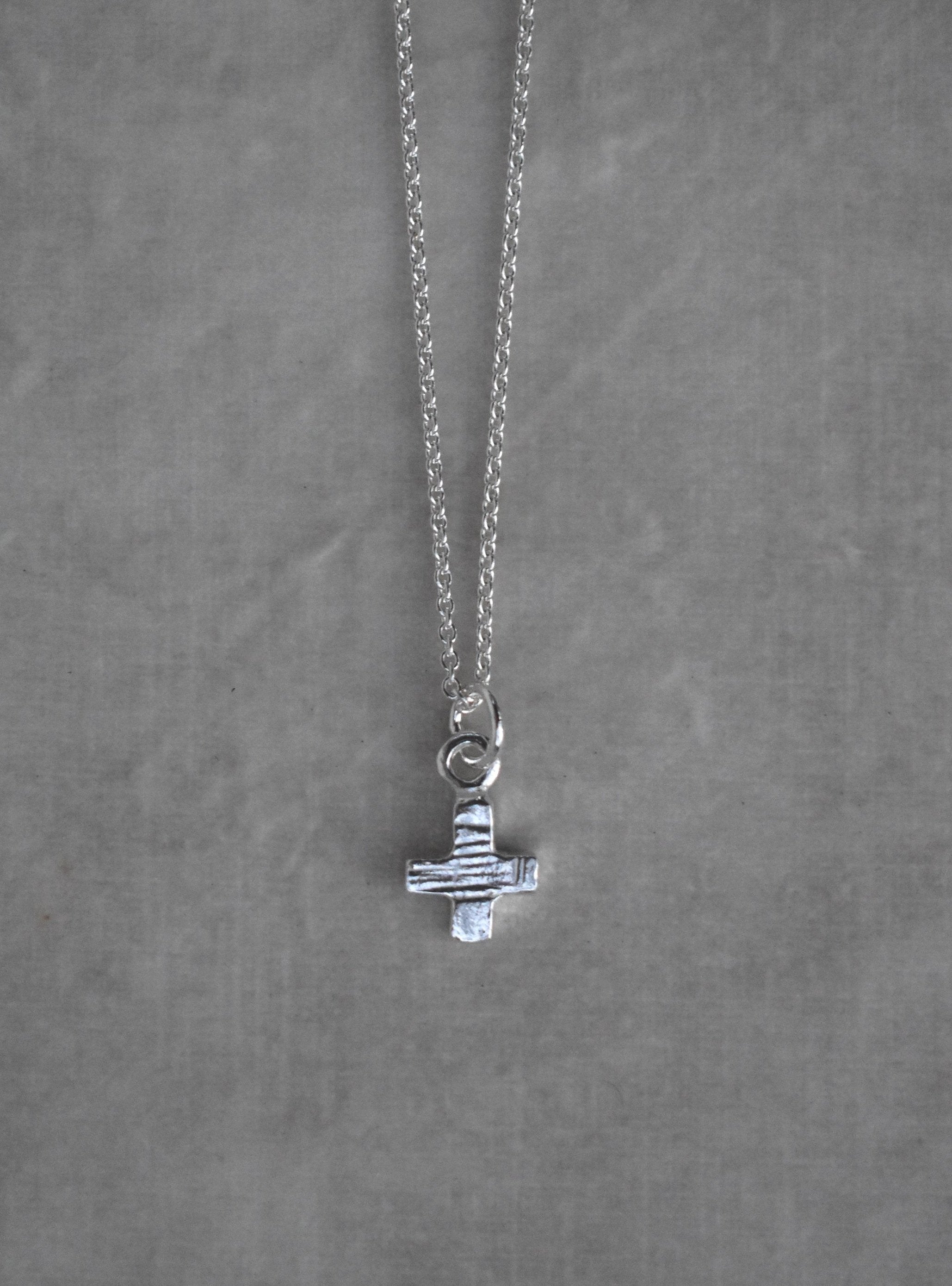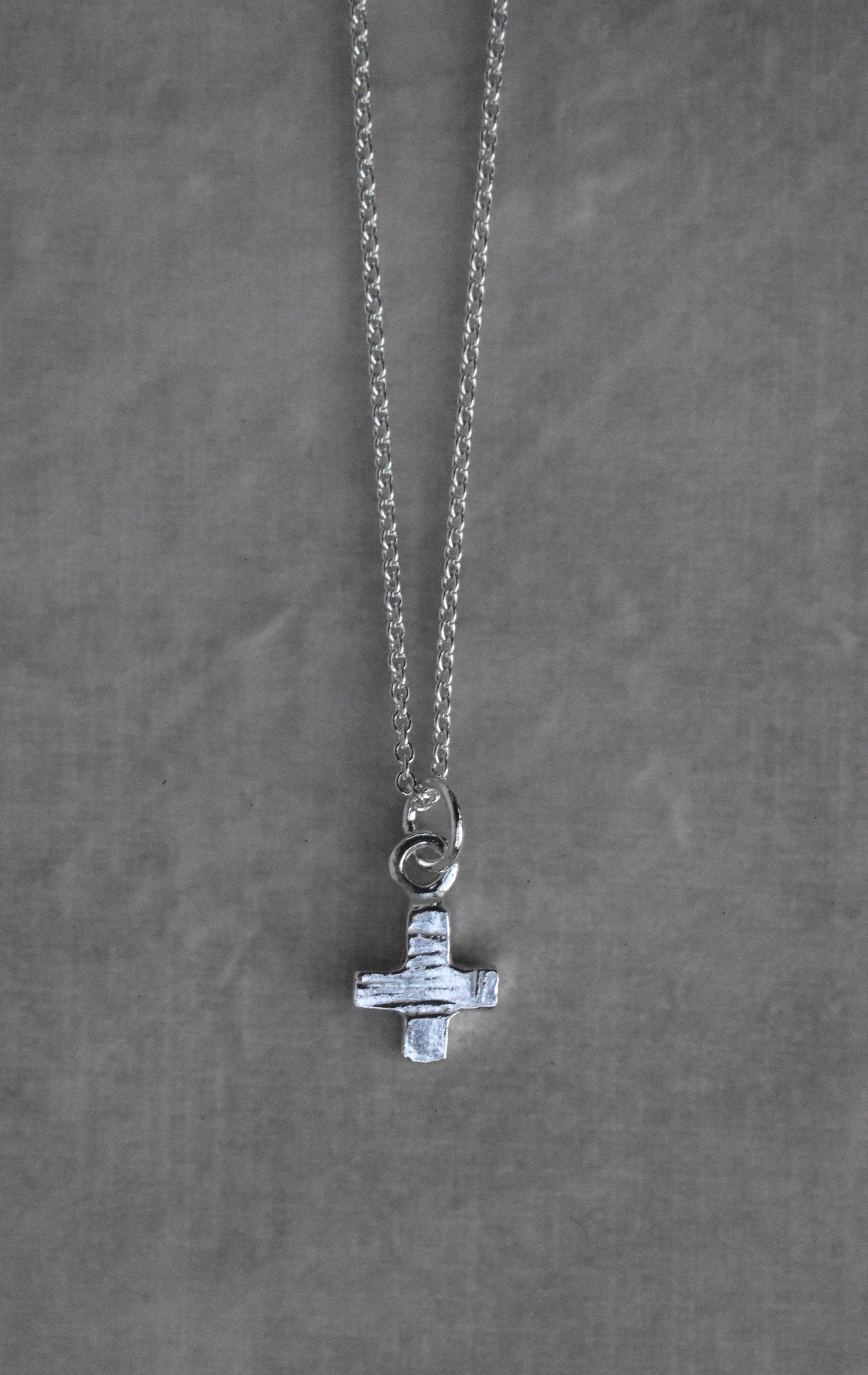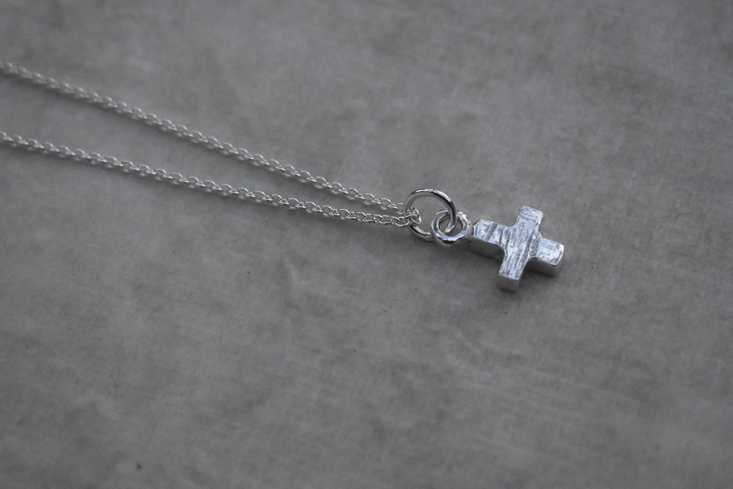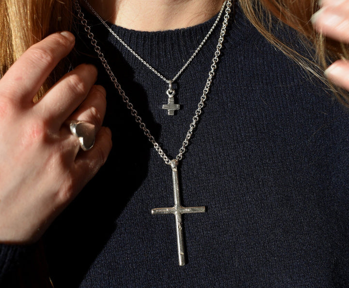 Solid silver hand carved mini cross necklace on a thick oval belcher chain. Part of the XO collection to be worn alone as a simple piece or layered up with other necklaces.
