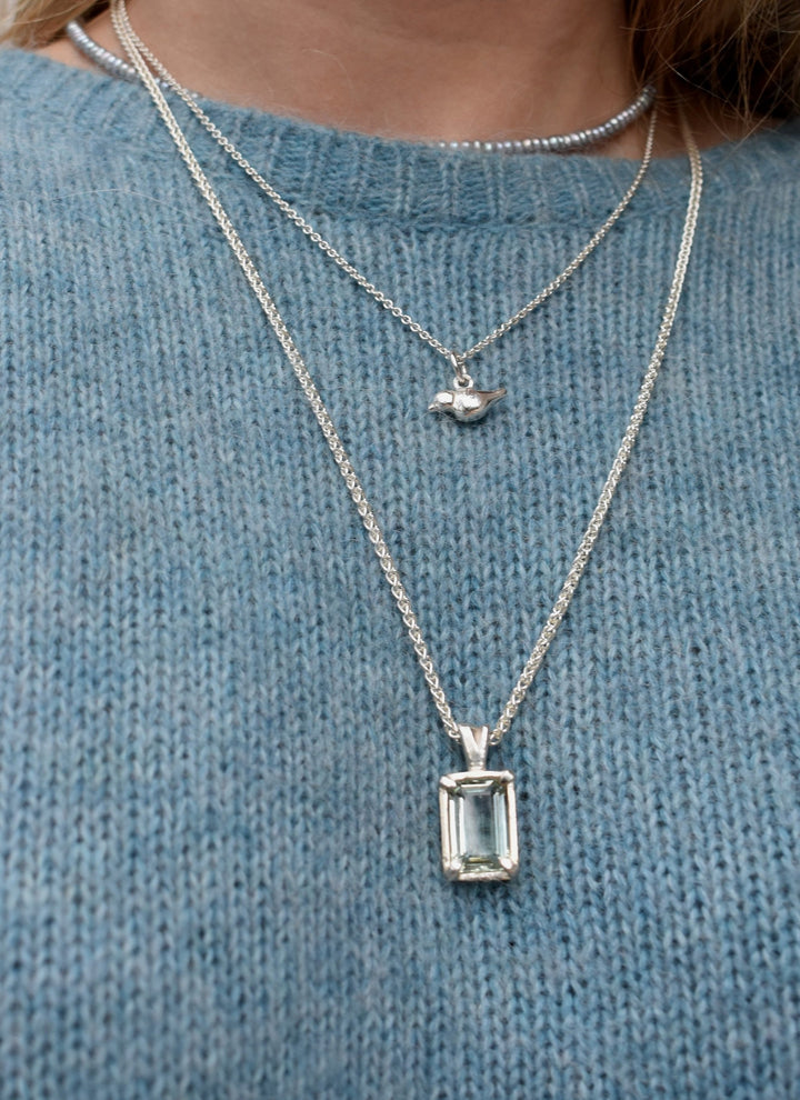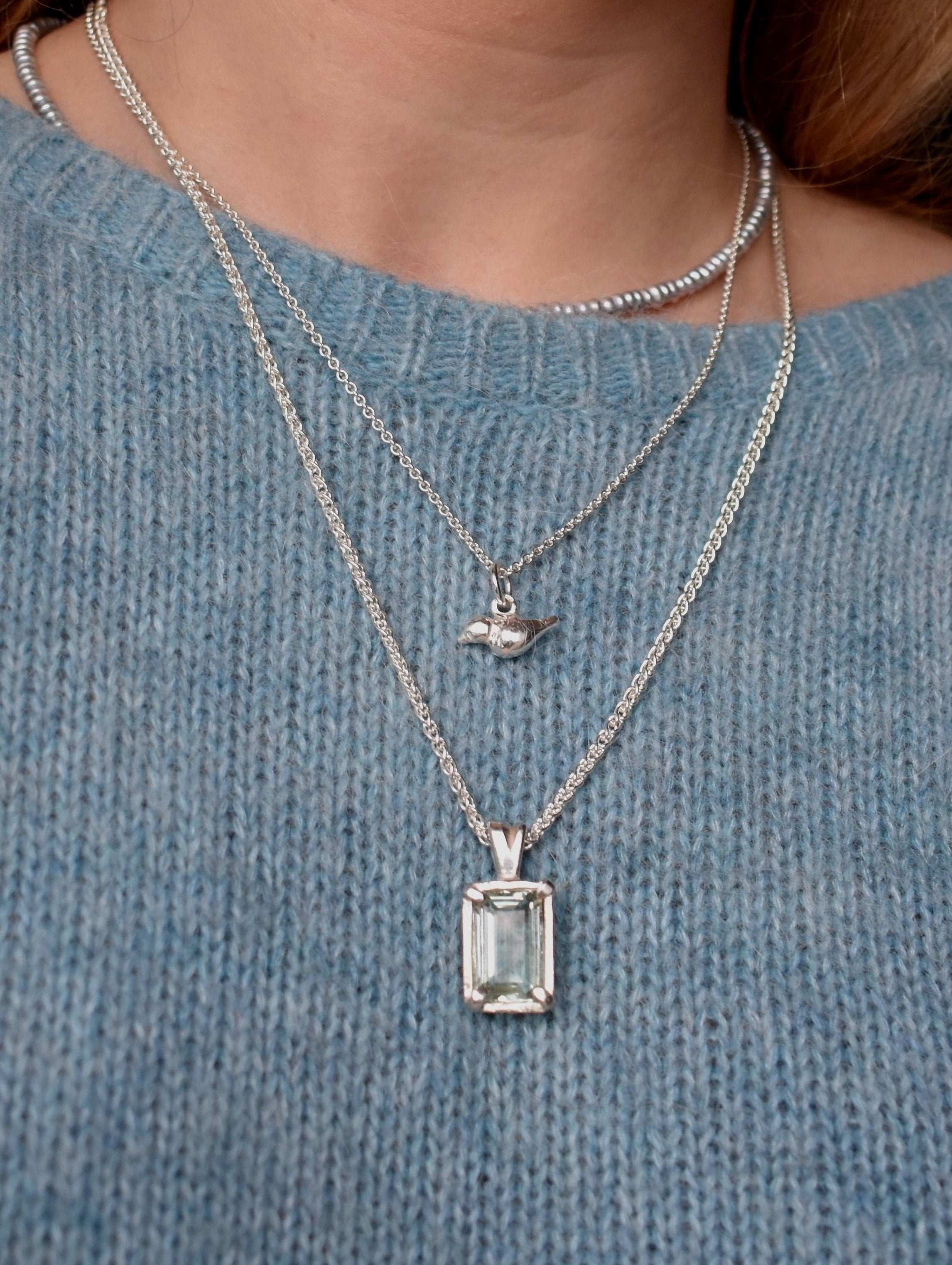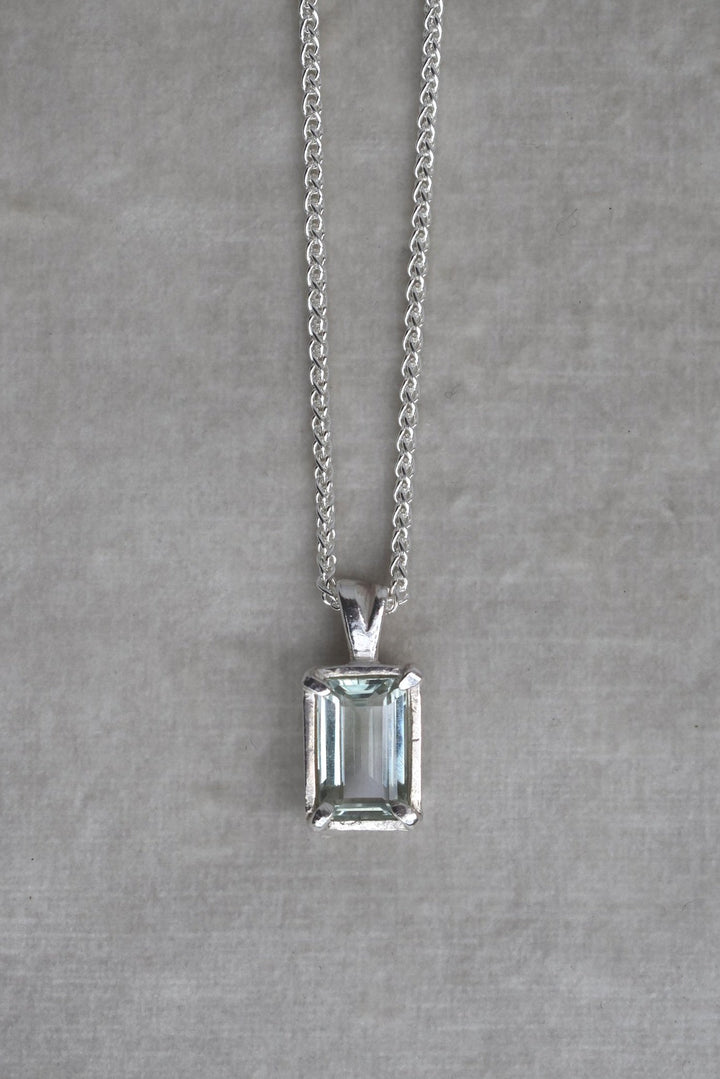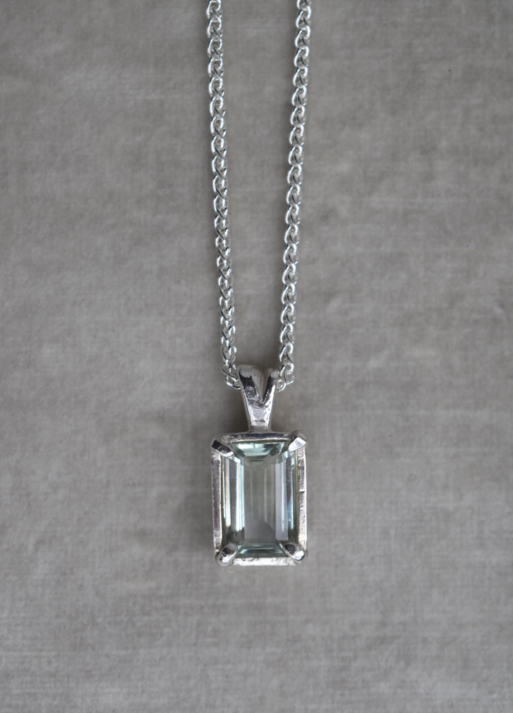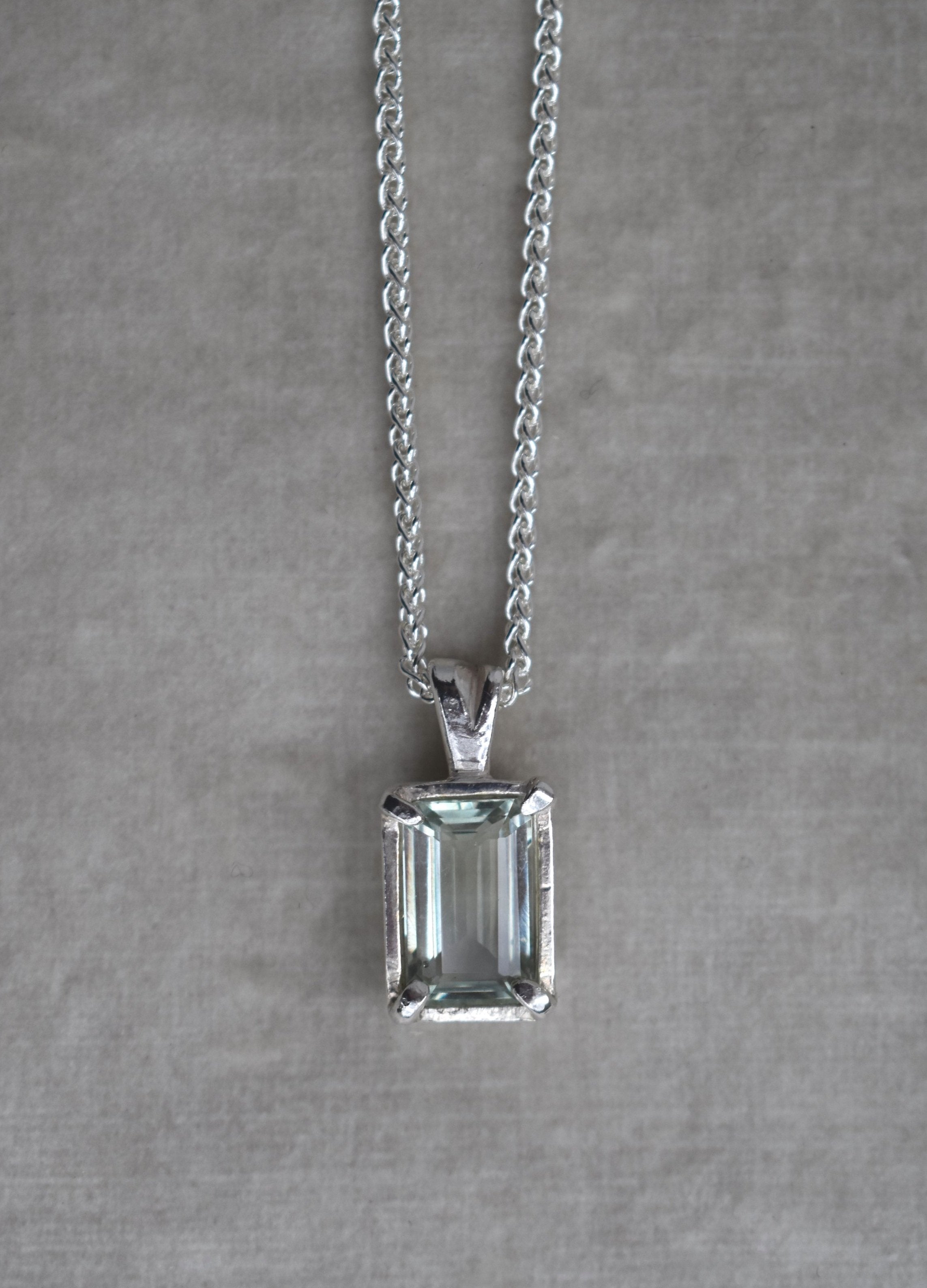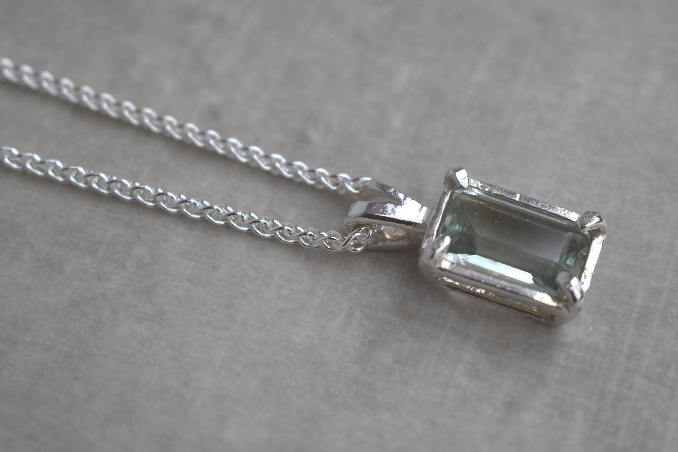 Sparkling emerald cut green amethyst stone set in silver. This stone is an ethically sourced gemstone.