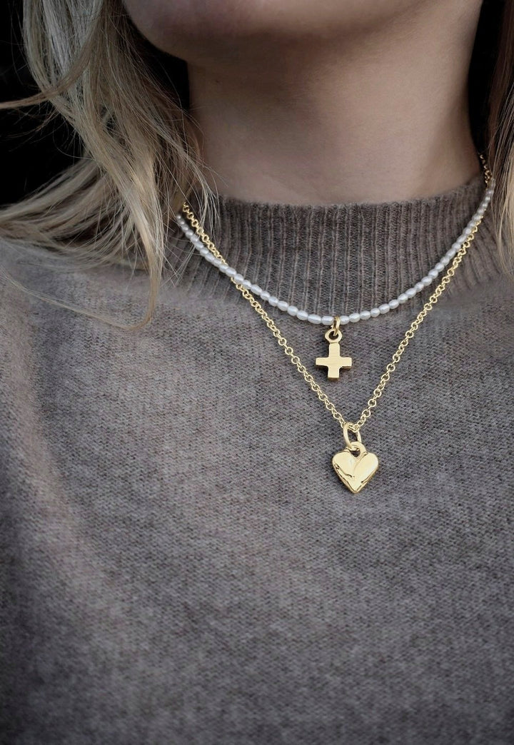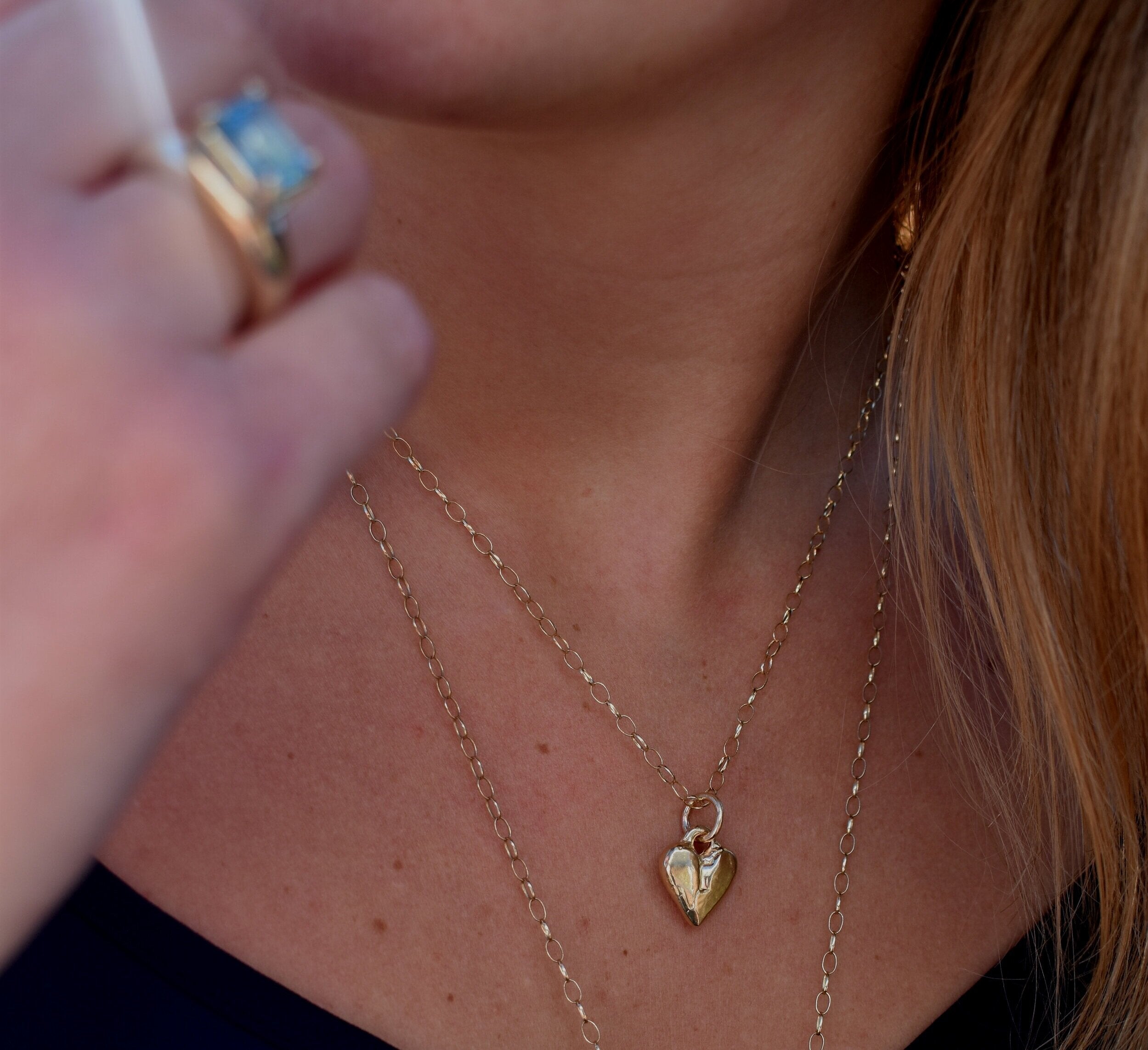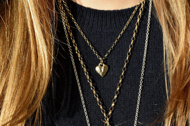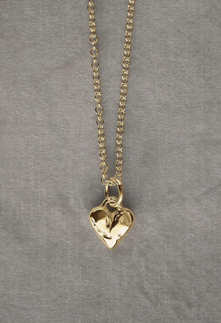Hand carved heart charm in 9ct yellow gold on a gold oval belcher chain.
