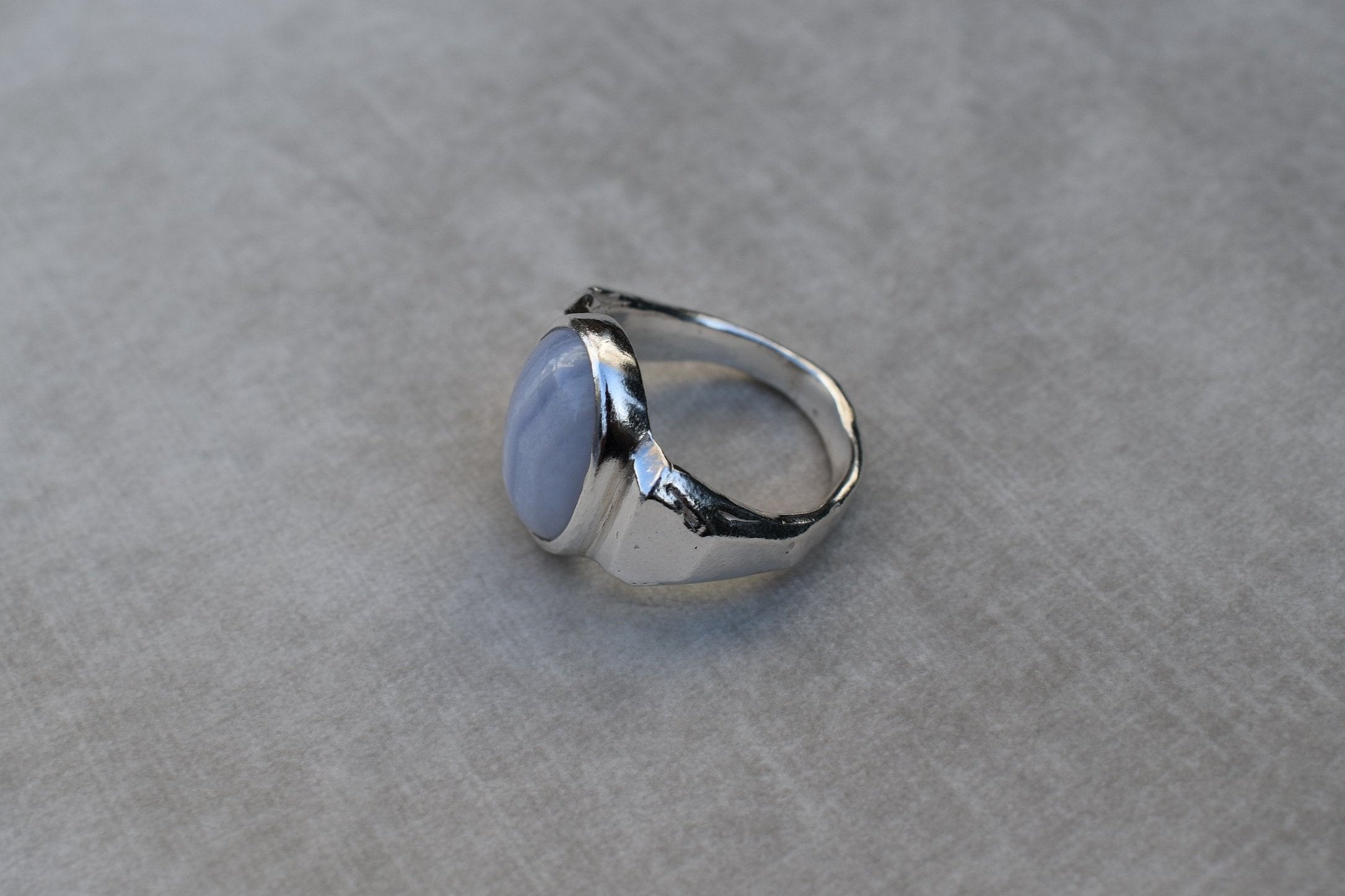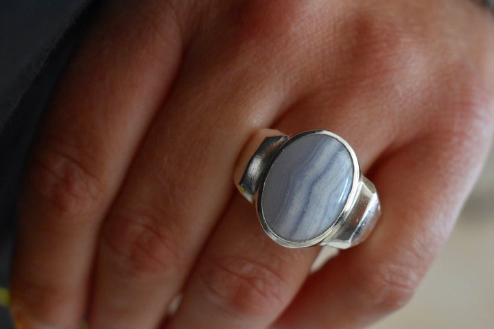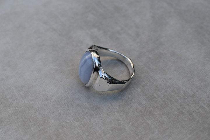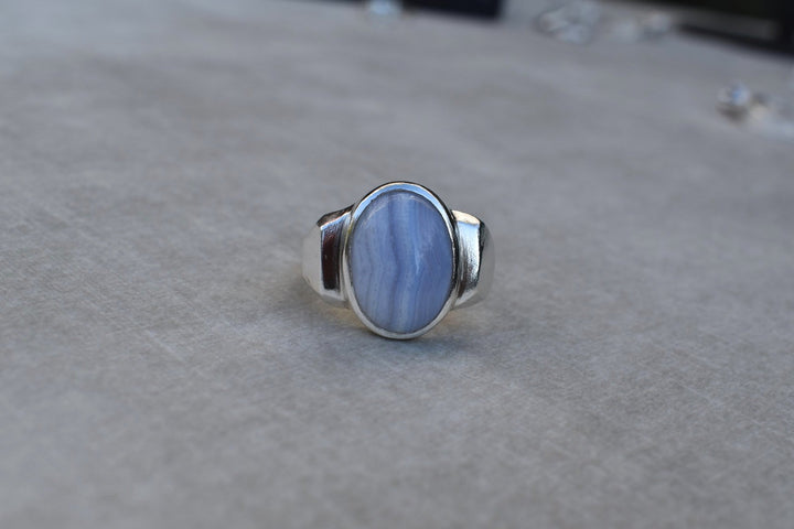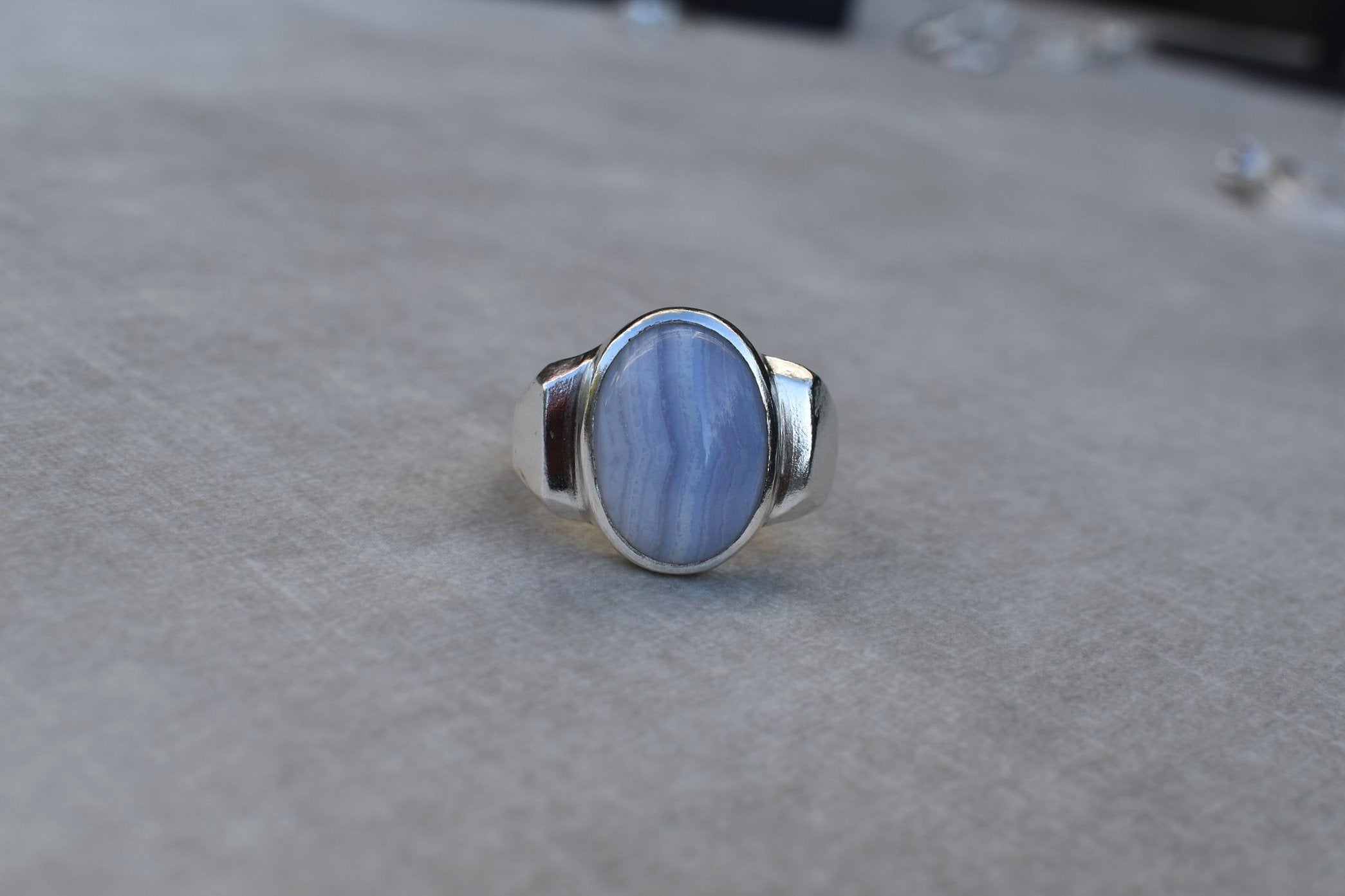Beautiful lace agate cabochon set in a thick solid silver ring.