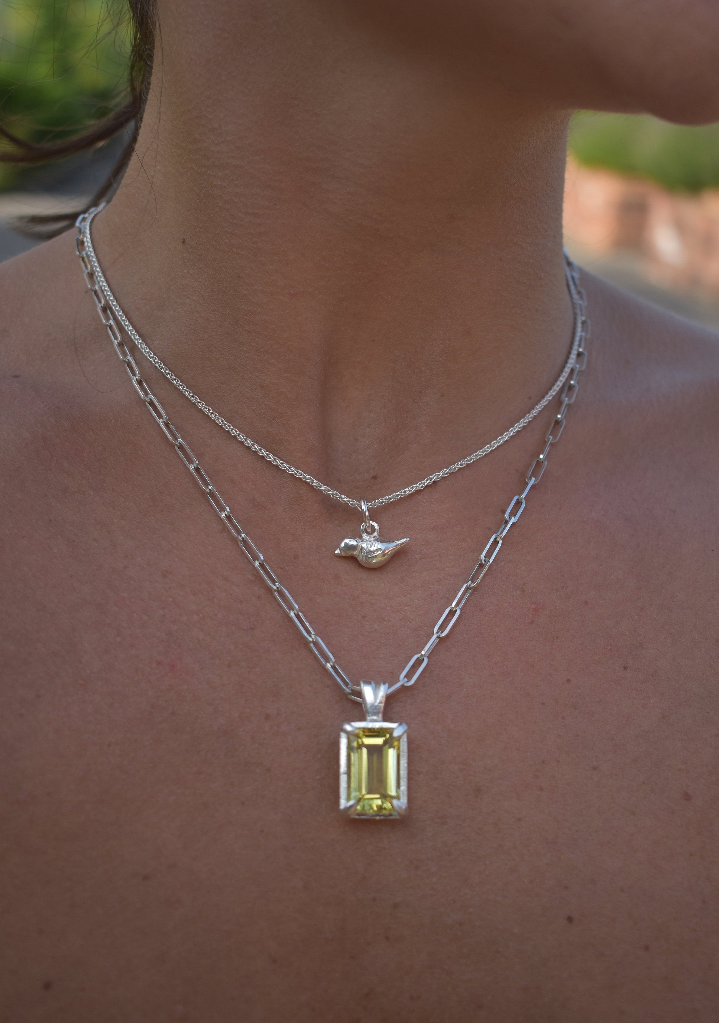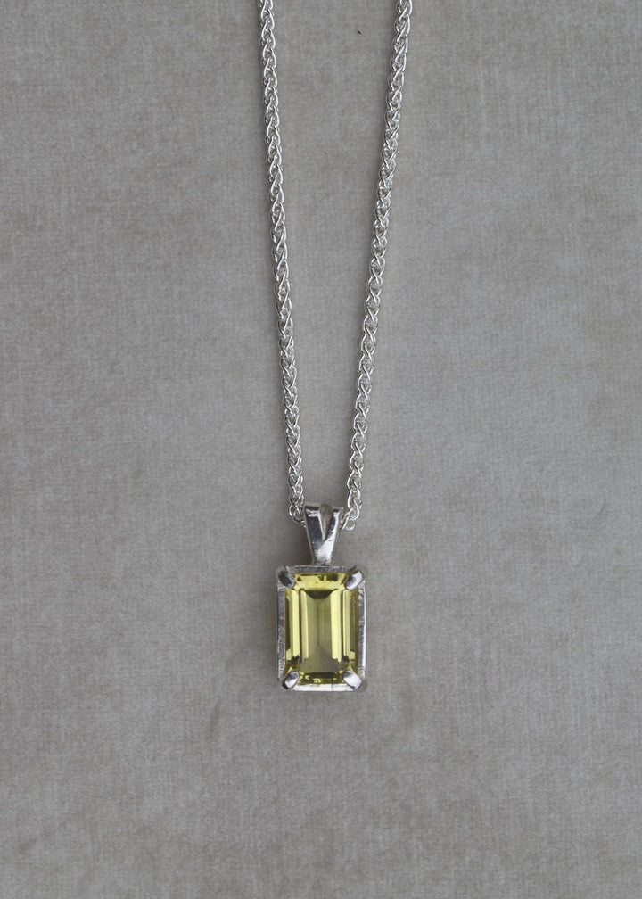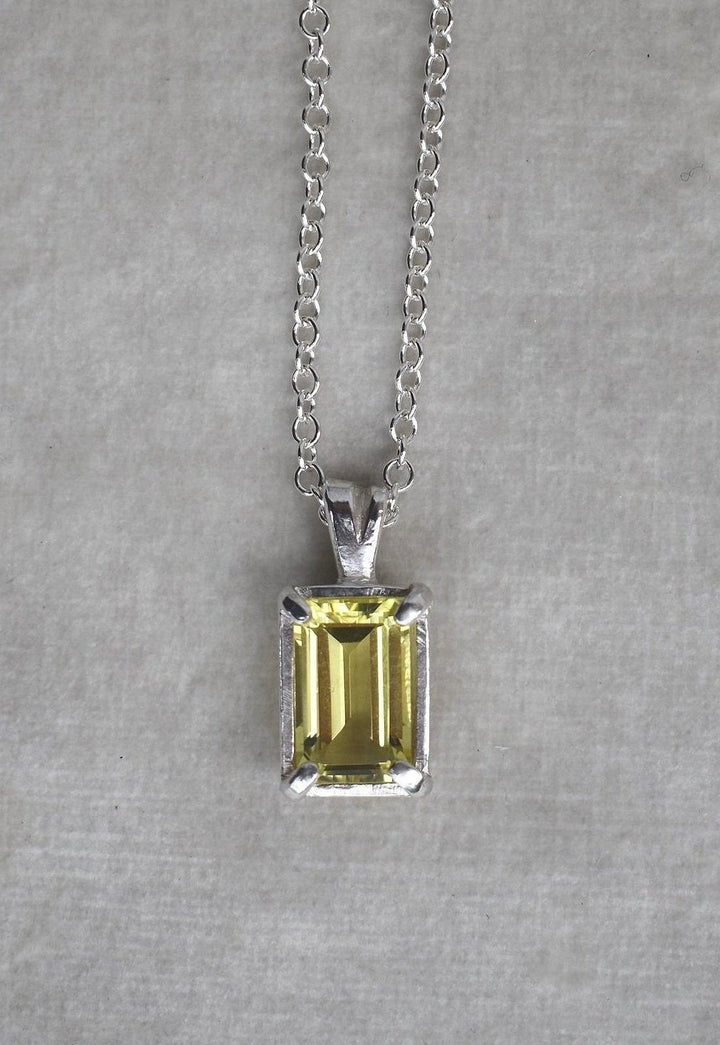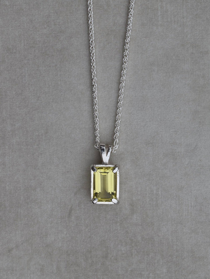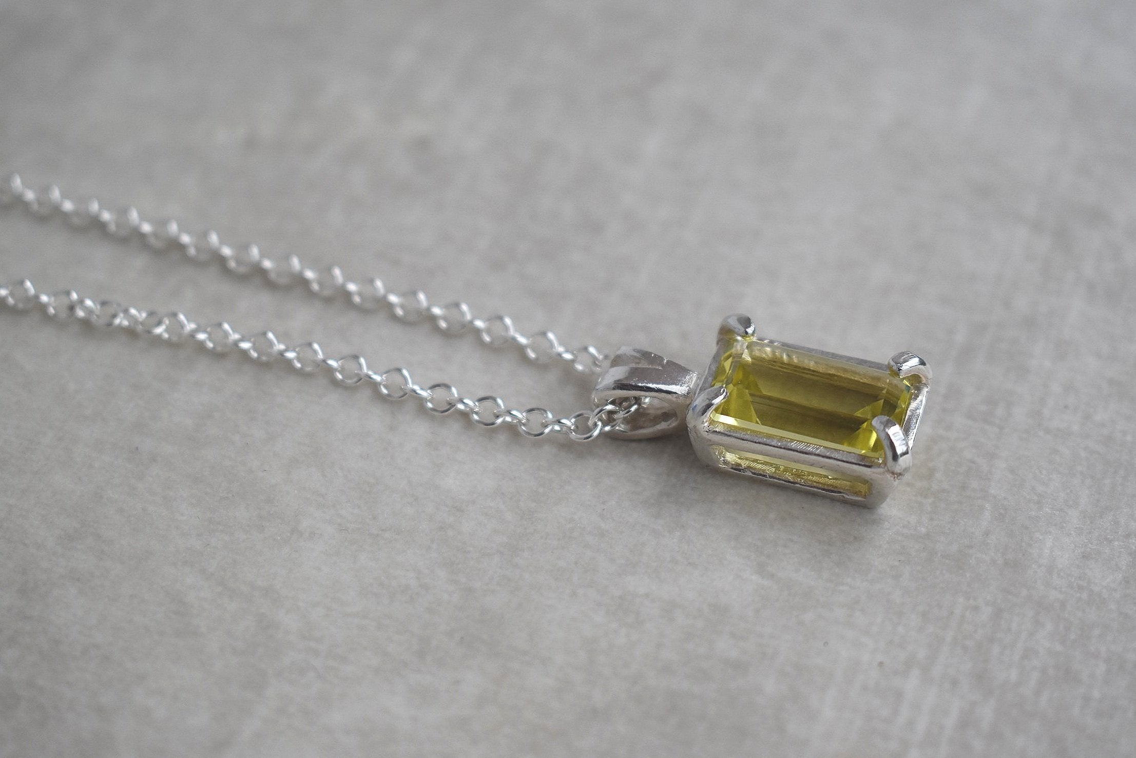 Sparkling emerald cut lemon quartz stone set in silver. This stone is an ethically sourced gemstone.