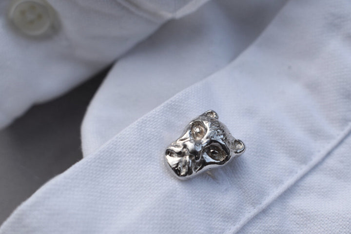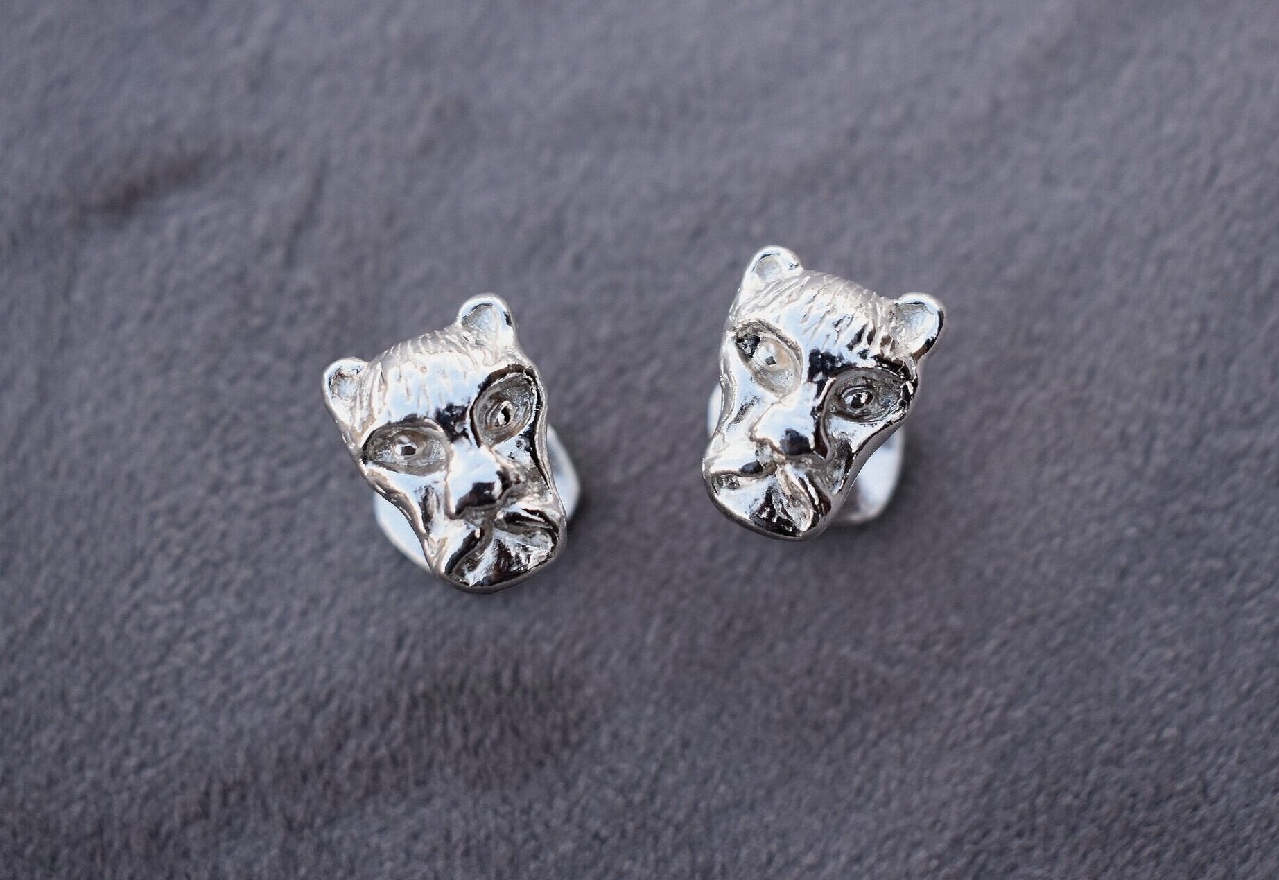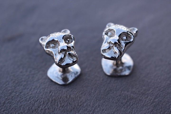 Solid silver hand carved leopard heads on a cufflink attachment. Part of the Jungle collection these are a great present for any special gentleman.
