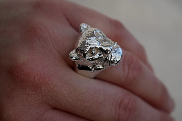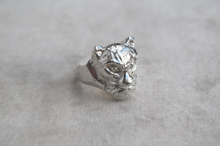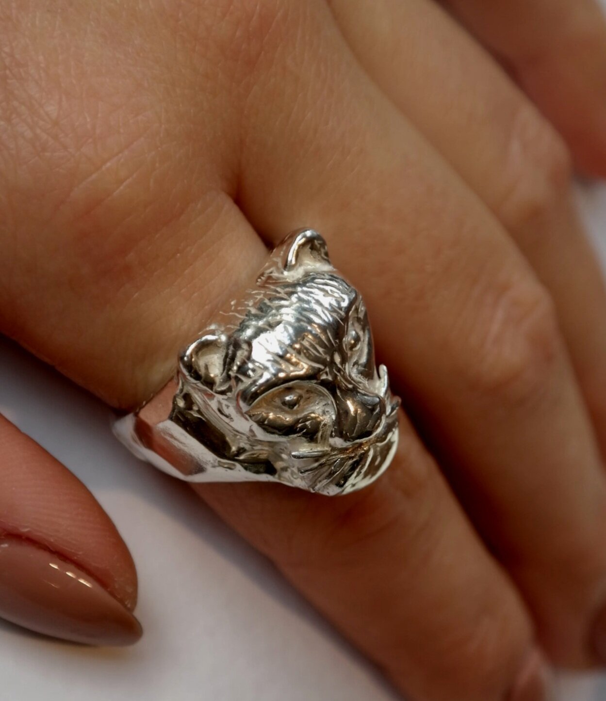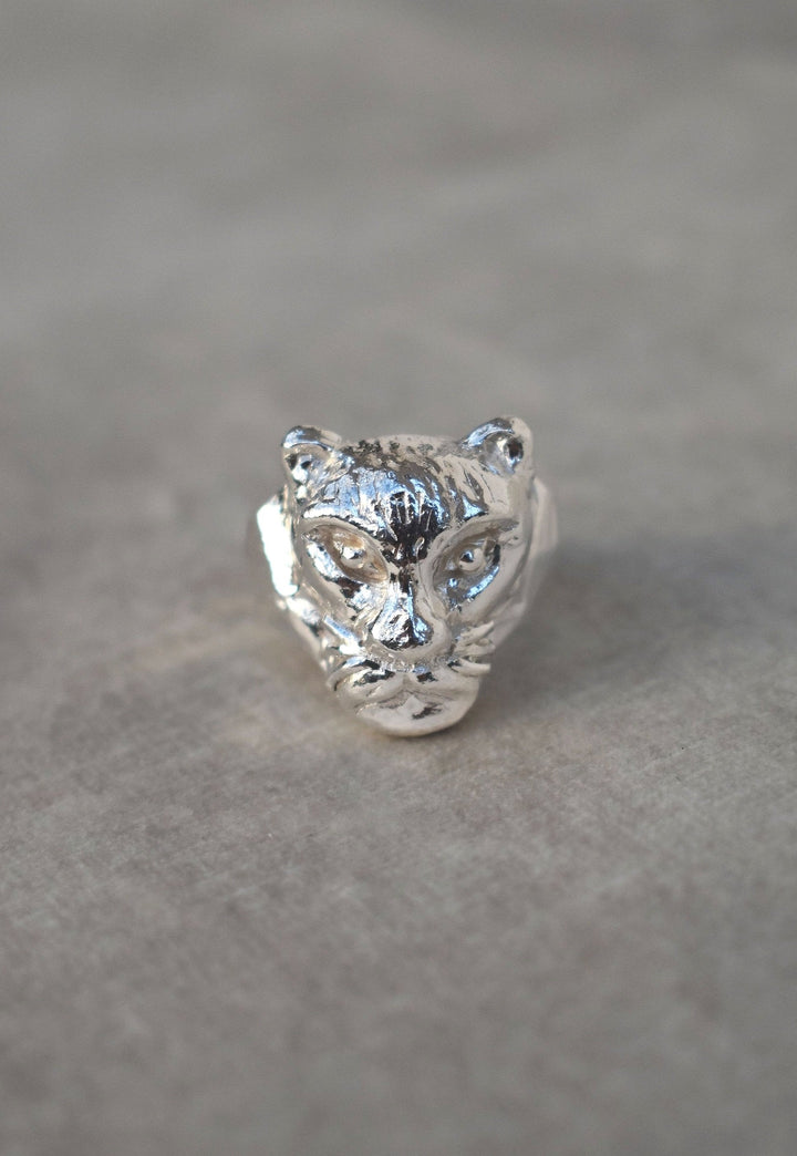 Giant Solid silver hand carved ring with striking leopard face. Large statement piece.