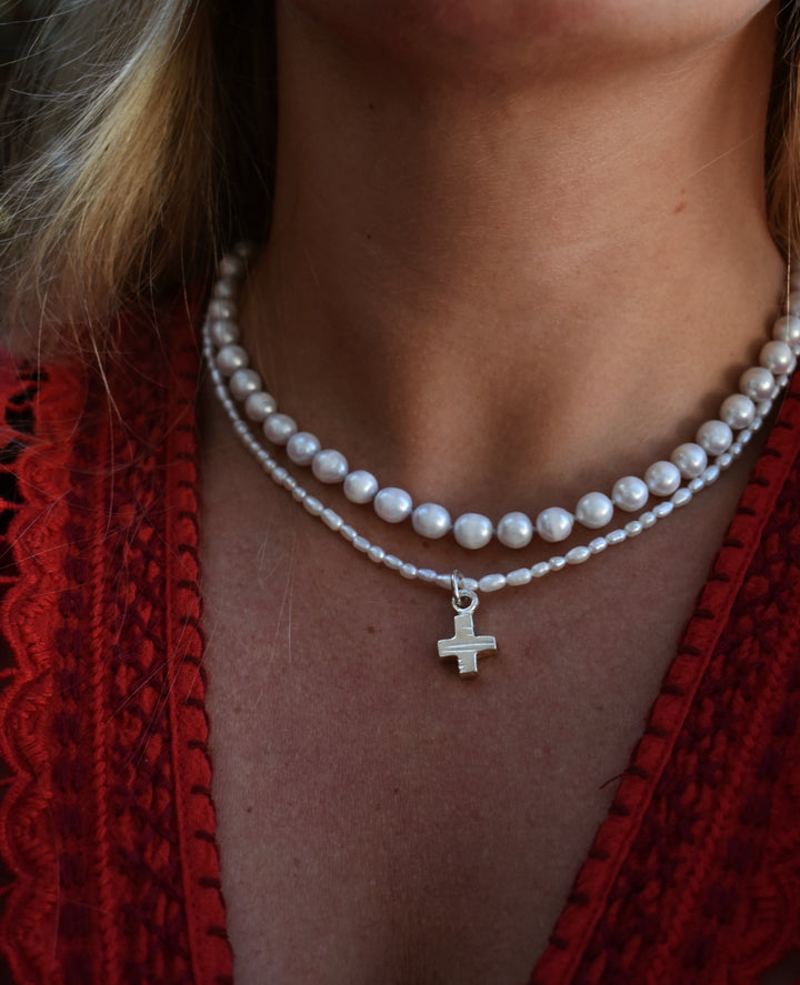Large freshwater pearl hand strung necklace. Round, imperfect hand knotted with natural silk and set with a solid silver clasp.