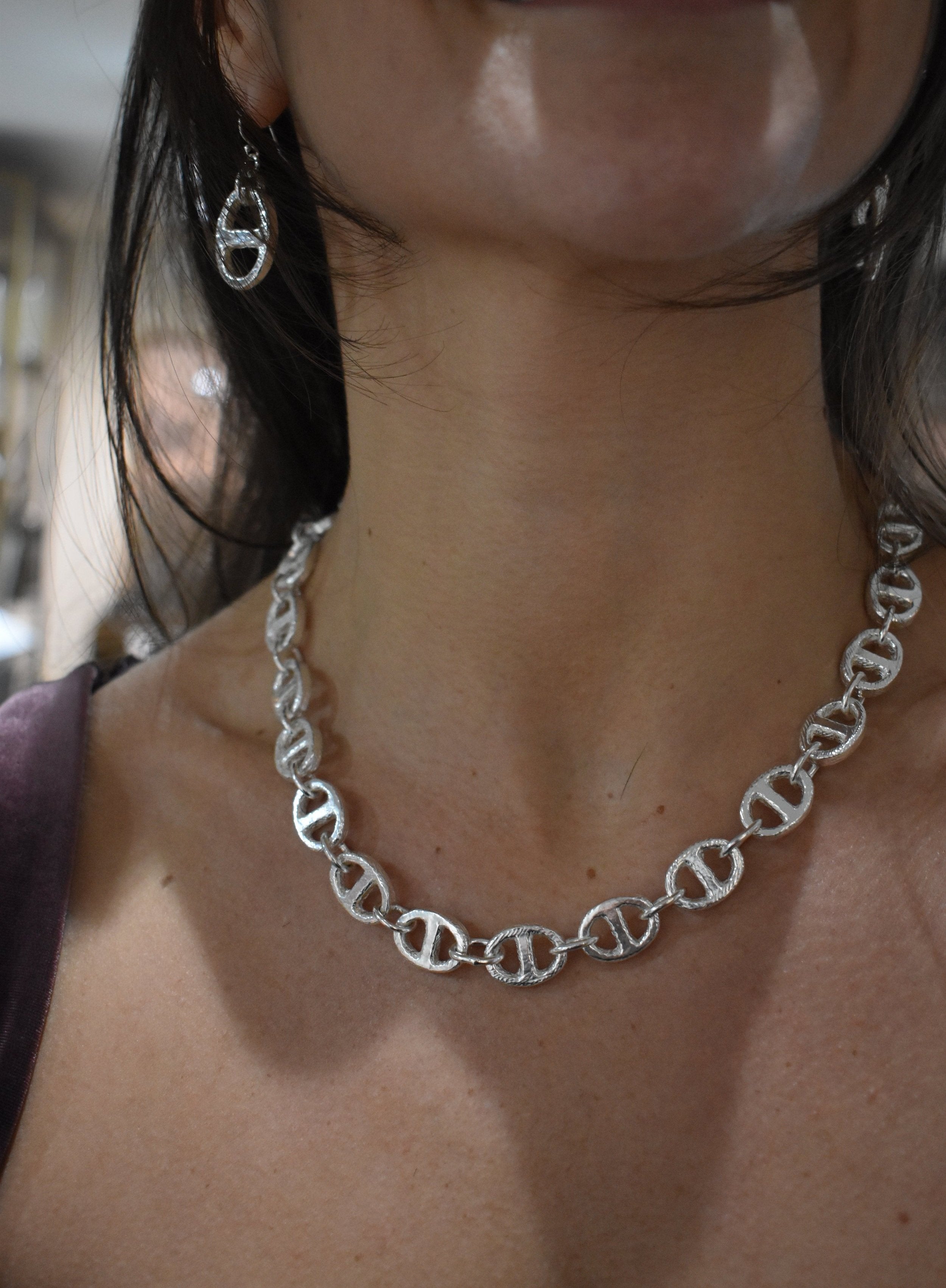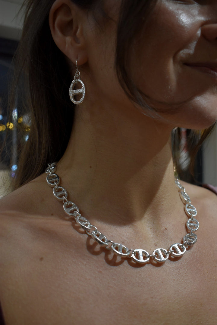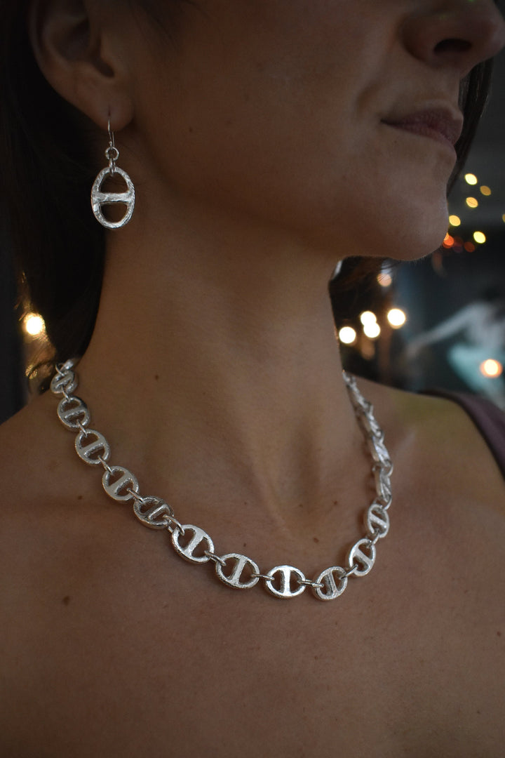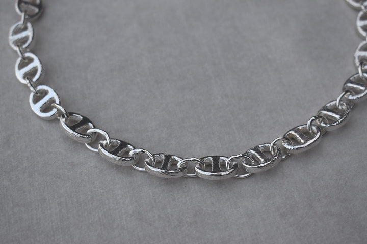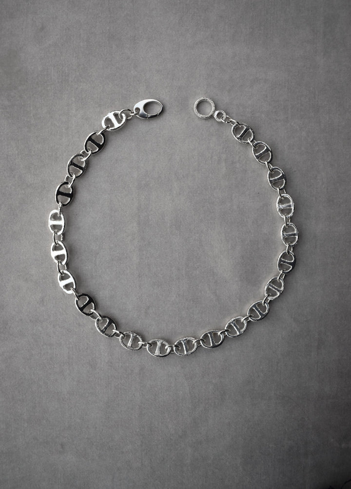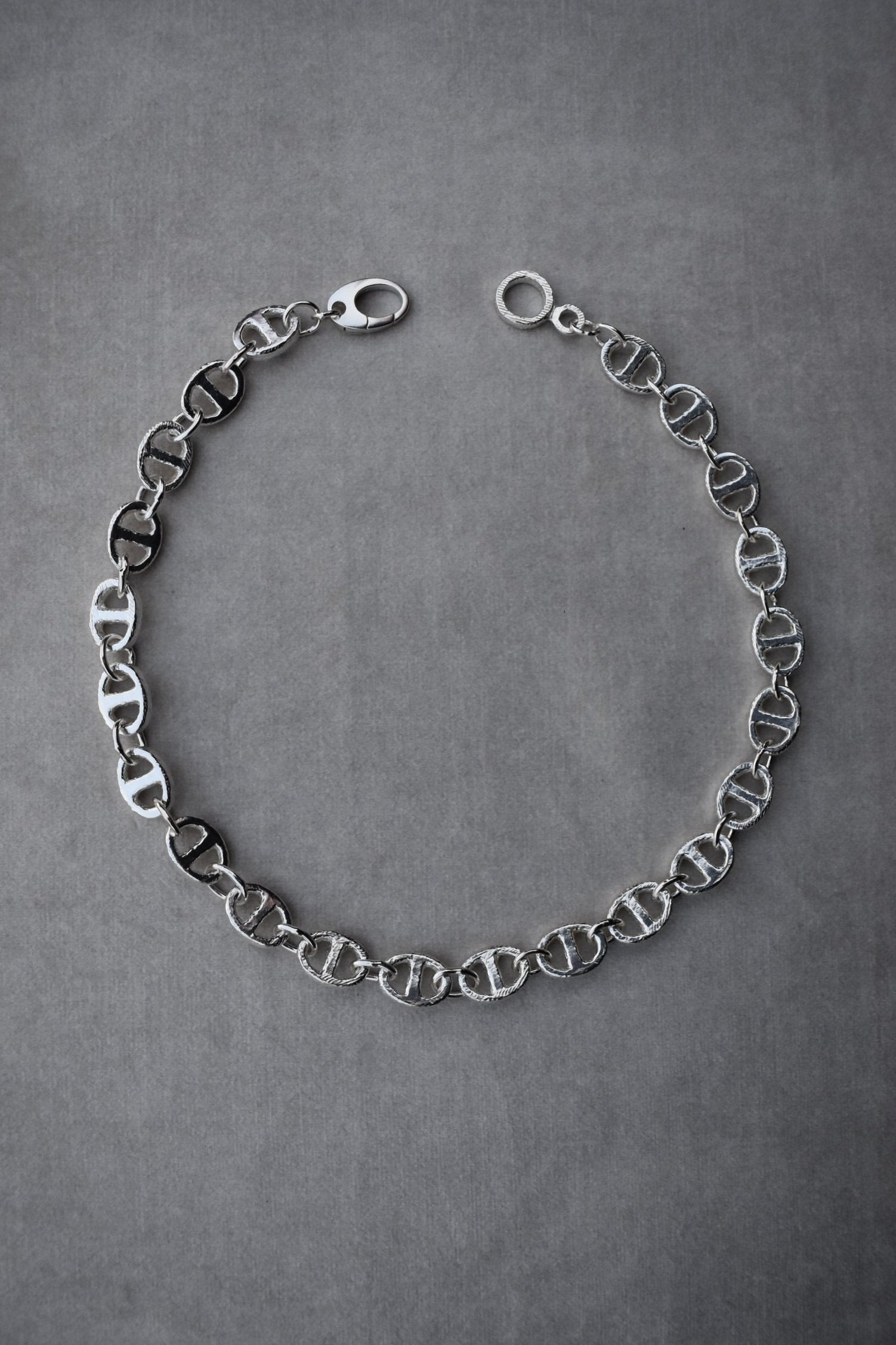 Silver marine charms all linked together with a large handmade silver toggle clasp. This is a real heavy statement piece made from solid silver and totally unique.