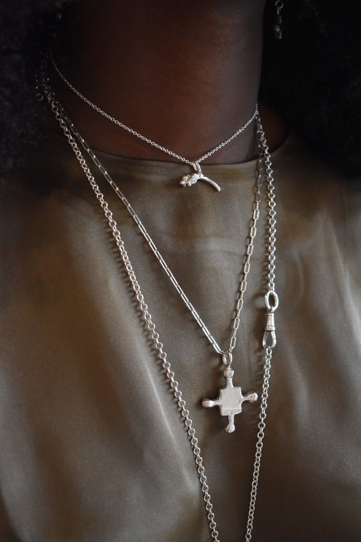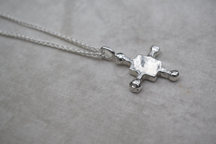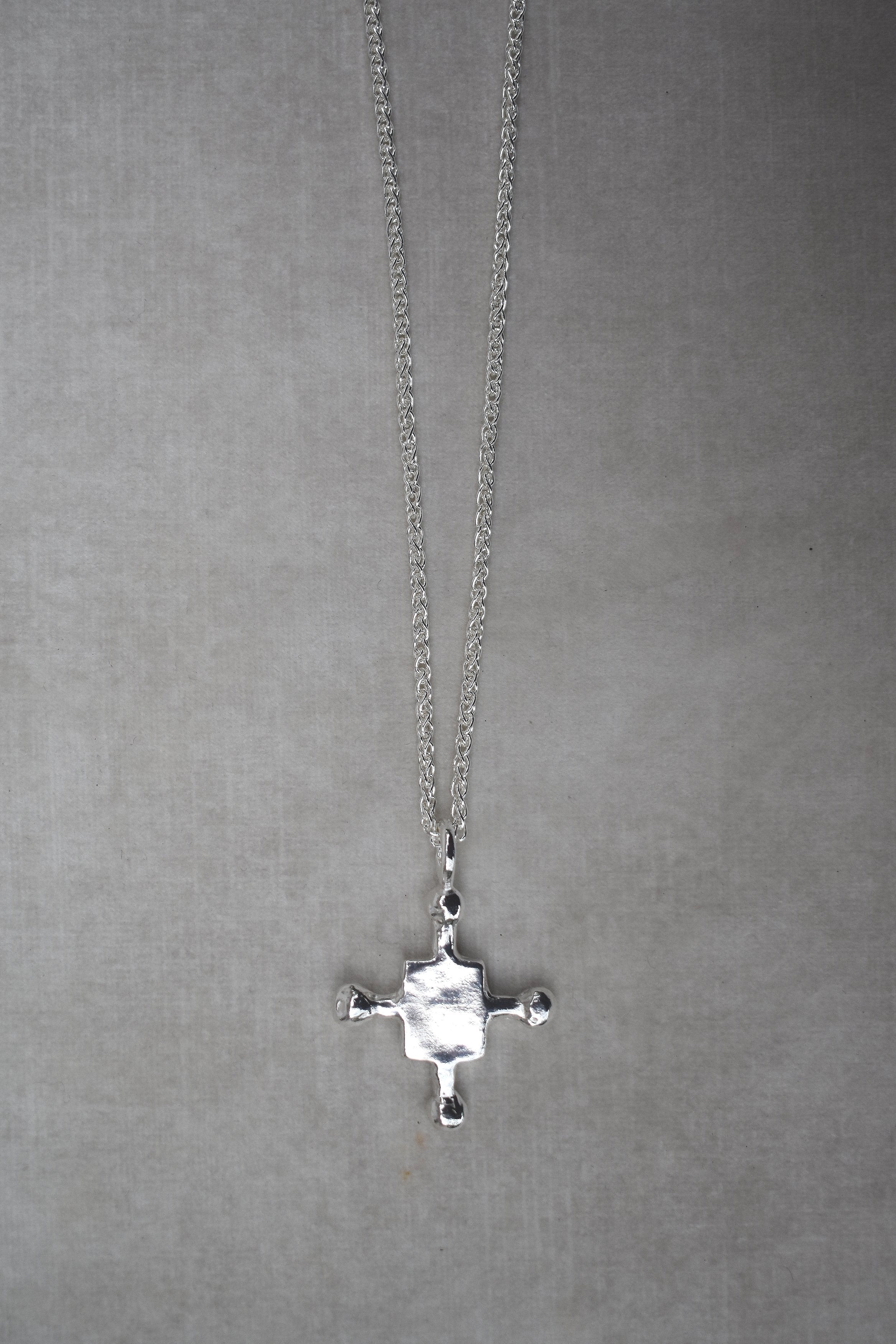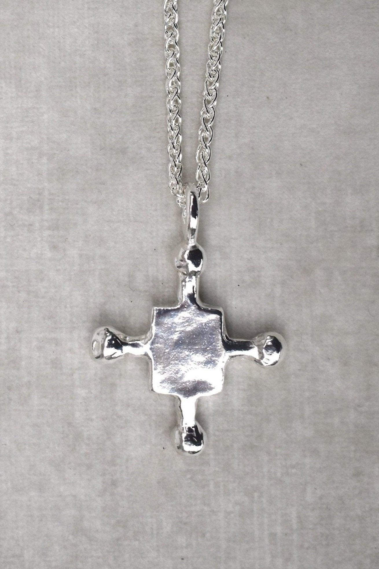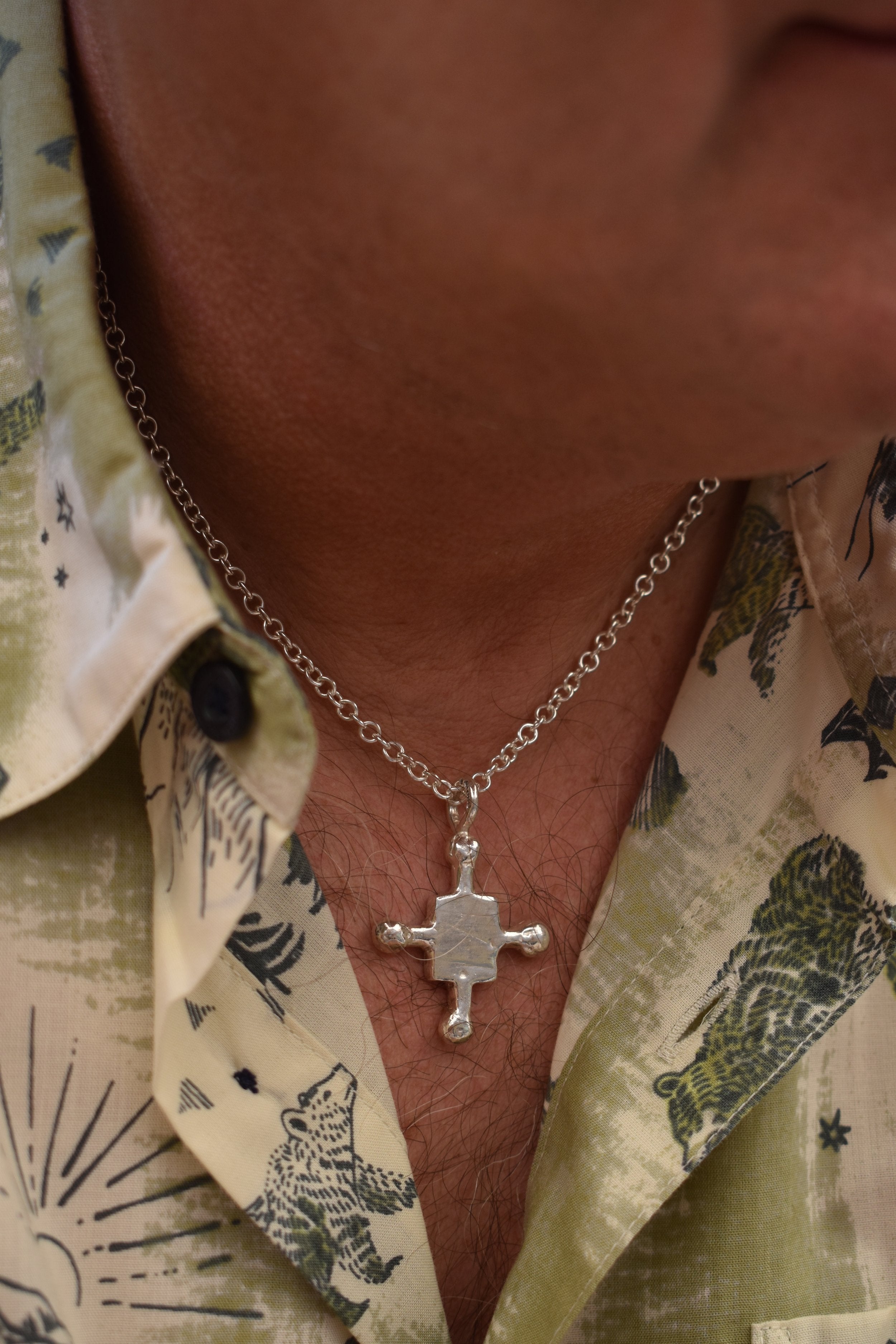 Solid silver hand carved viking cross amulet. Hangs on a slightly thicker silver chain as a proper statement piece.