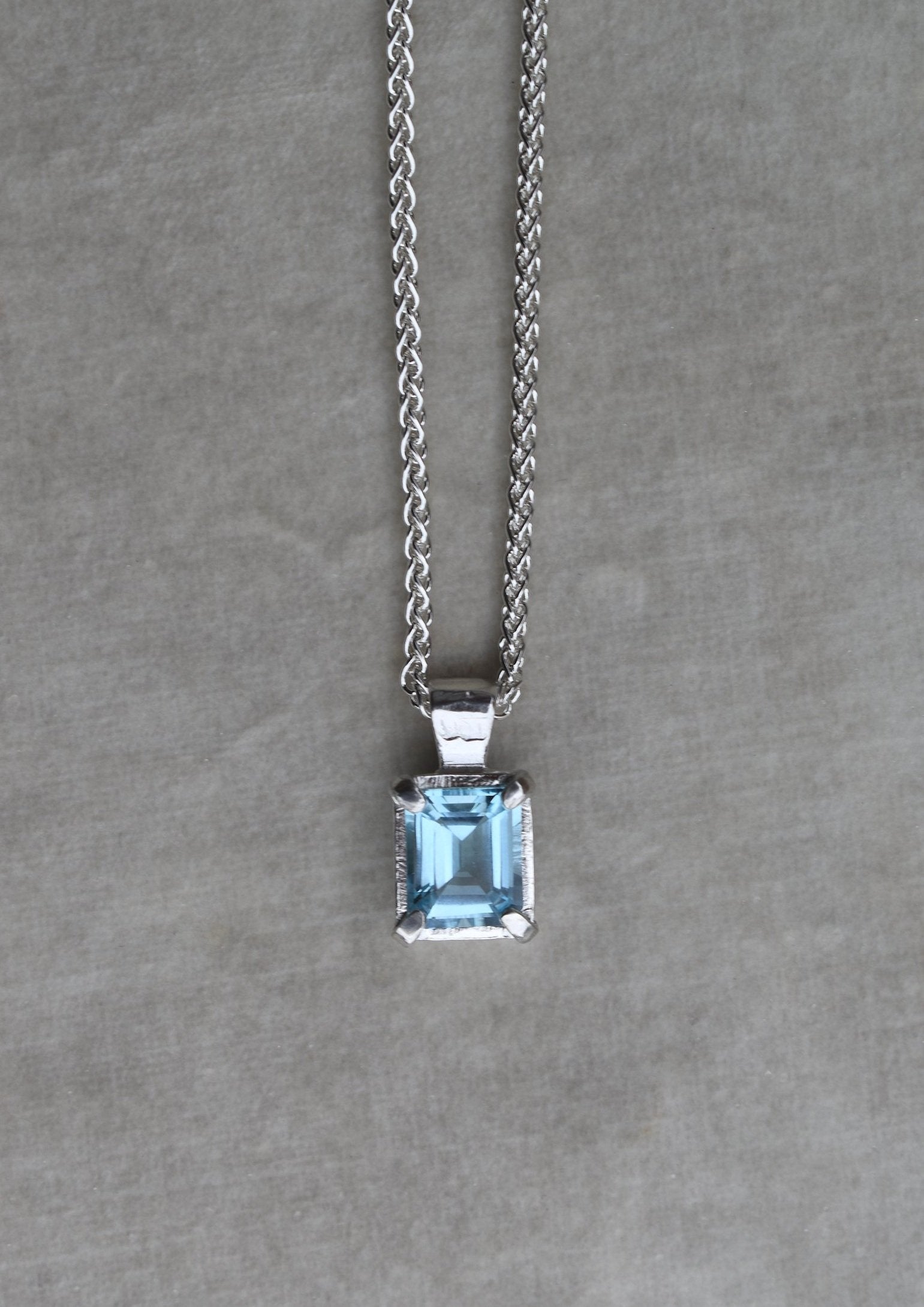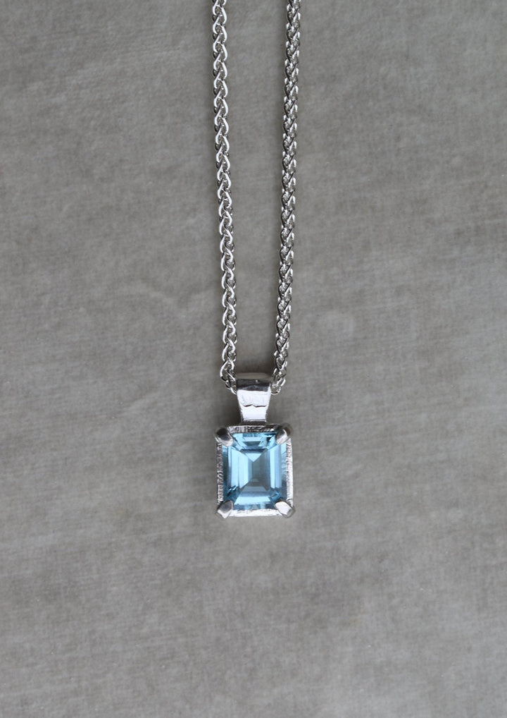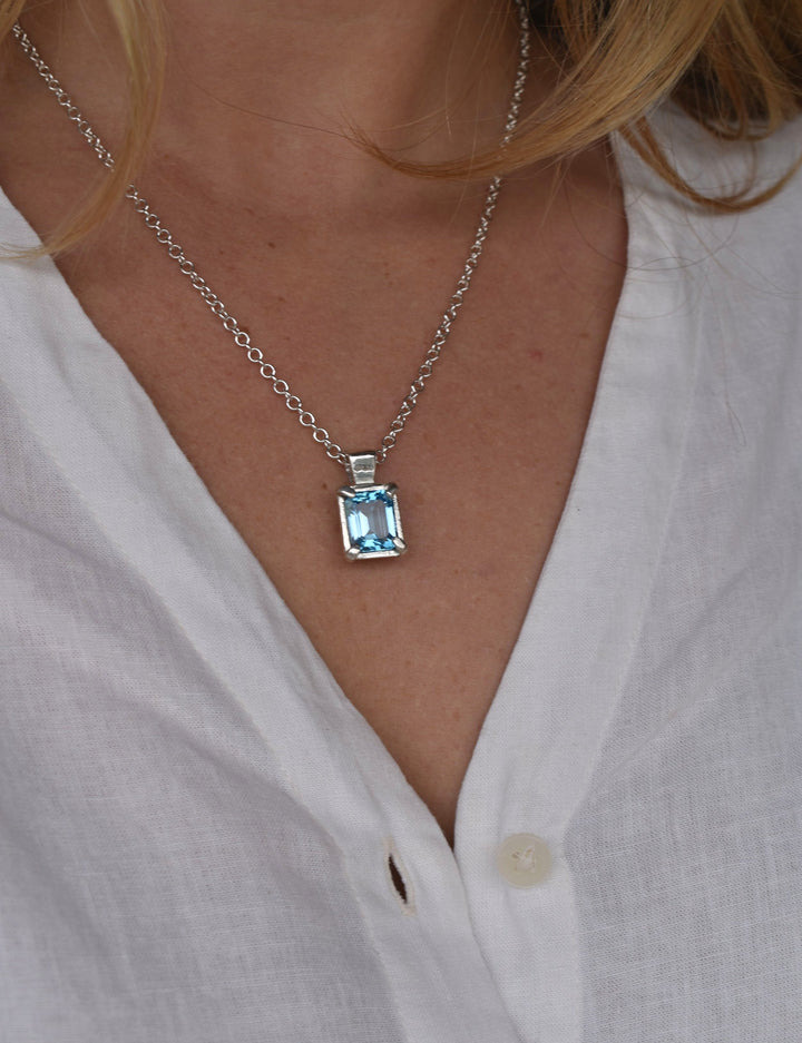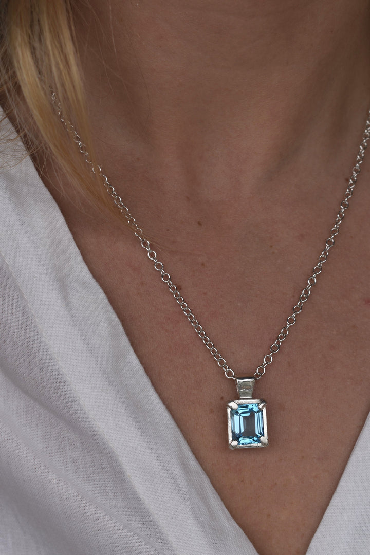 Emerald cut blue topaz set in silver on a belcher chain. Stone measures 12 x 10mm.