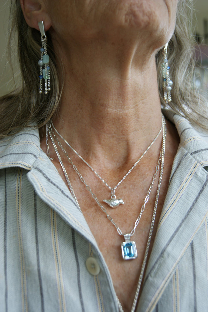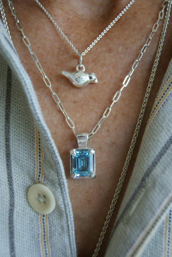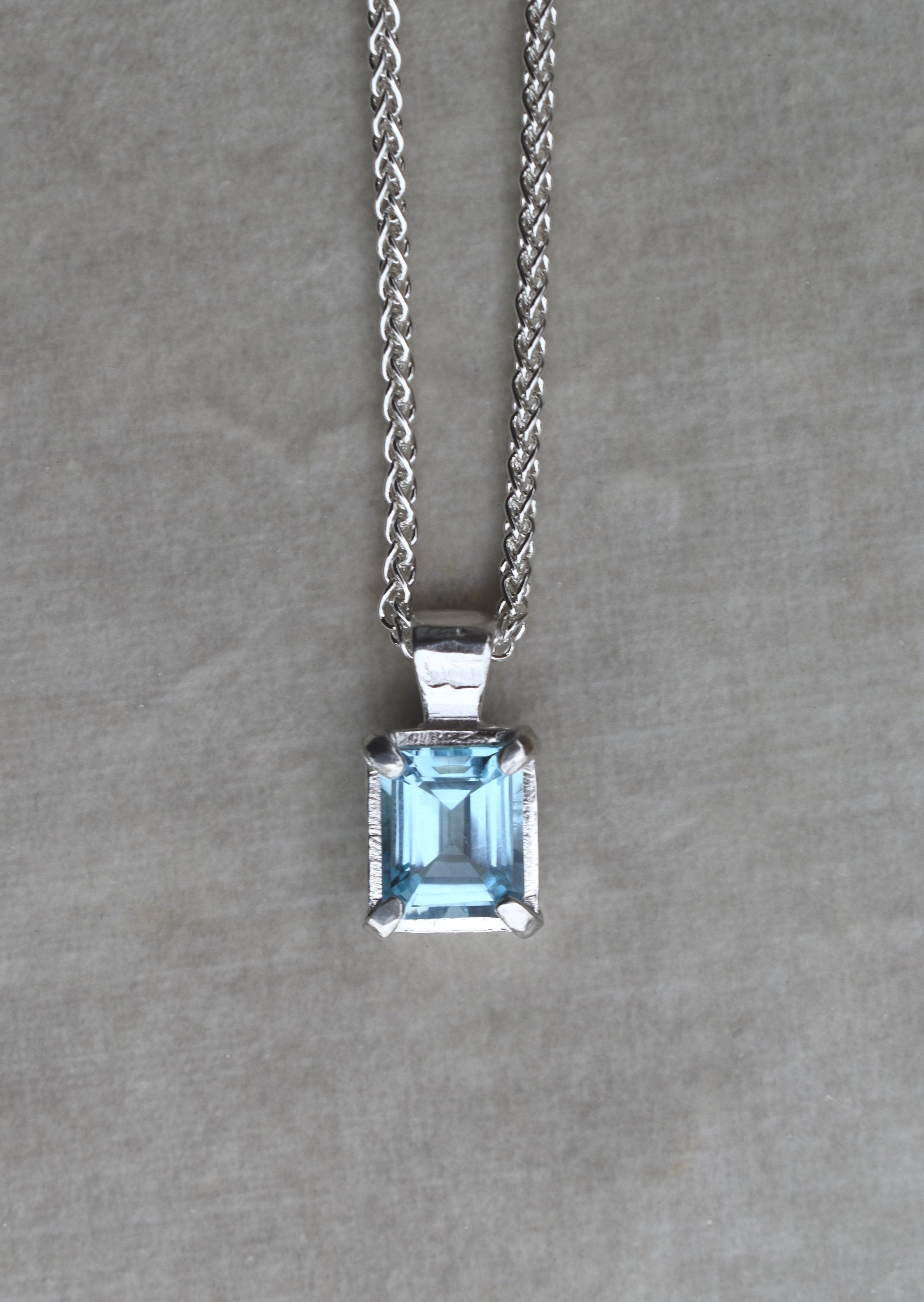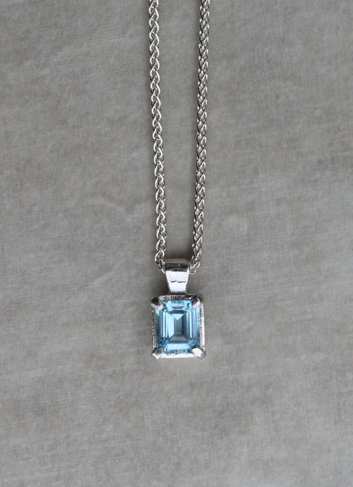 Emerald cut blue topaz set in silver on a belcher chain. Stone measures 12 x 10mm.