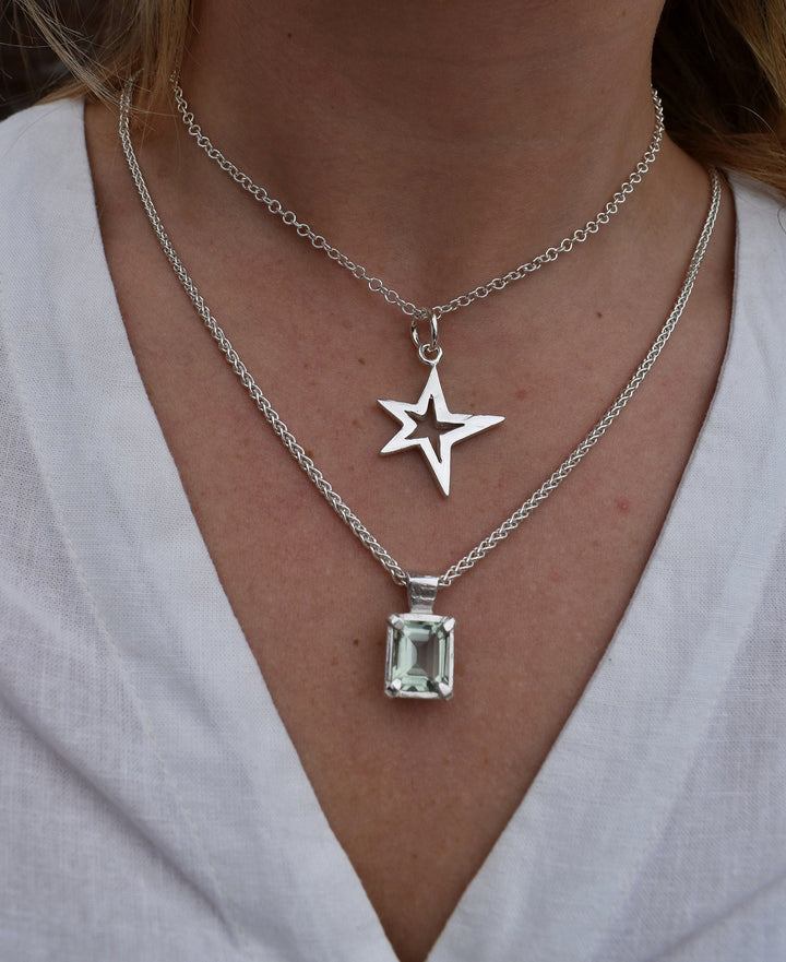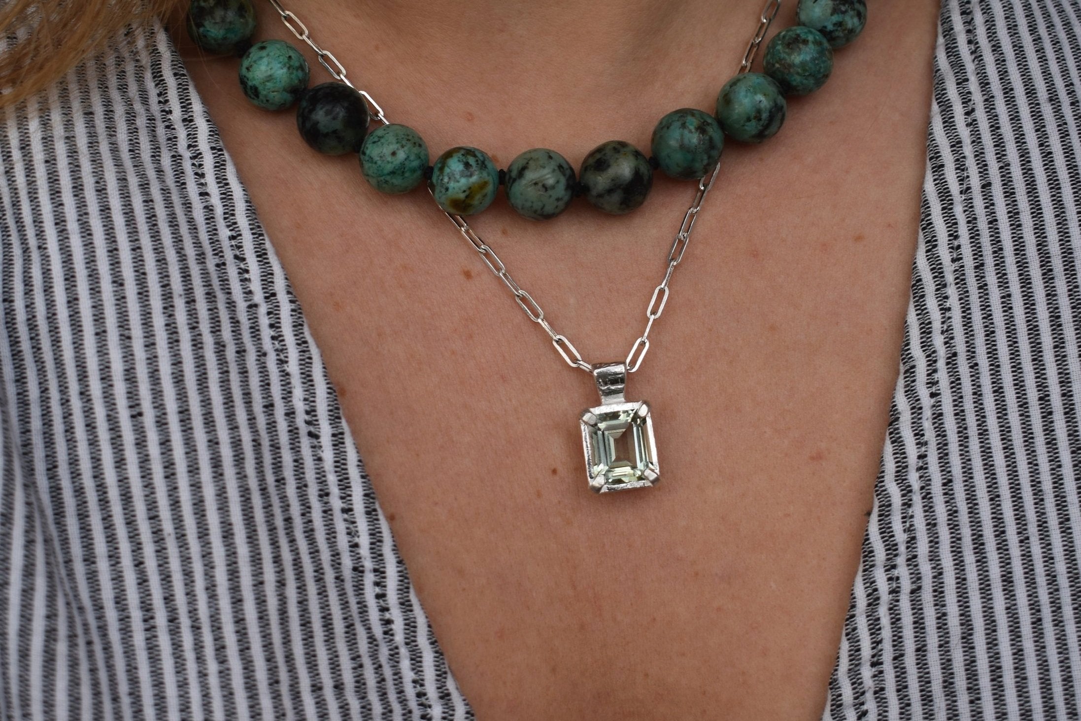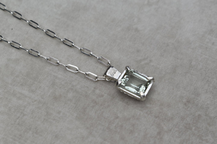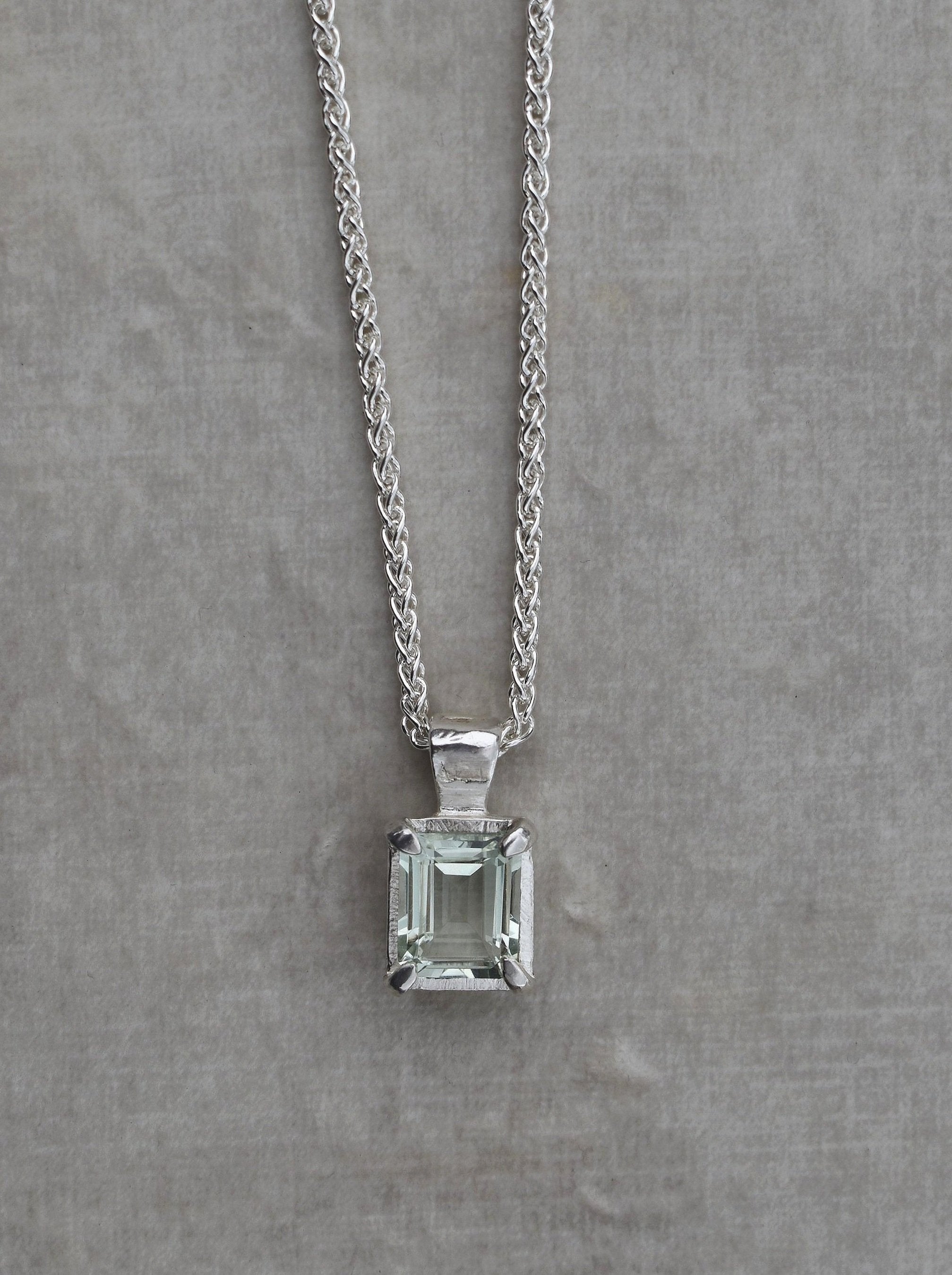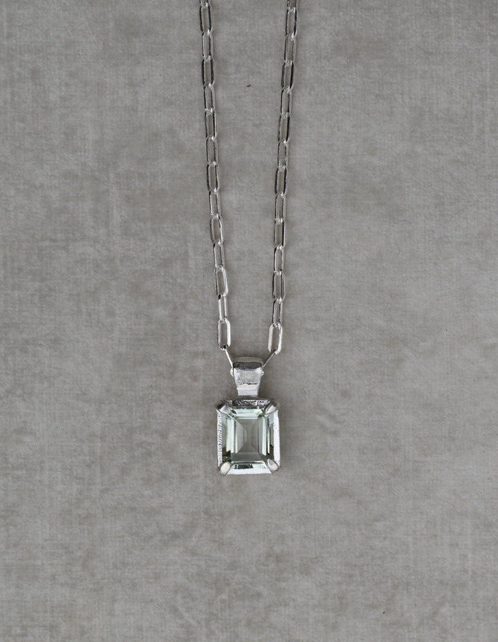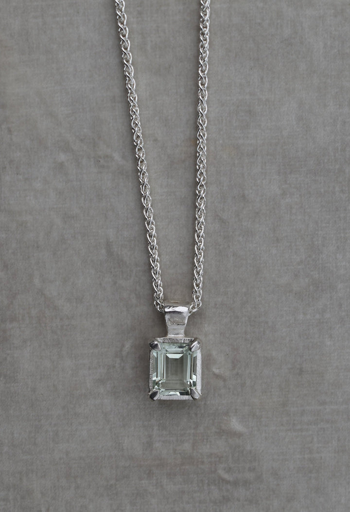 Emerald cut green amethyst set in silver on a belcher chain. Stone measures 12 x 10mm.