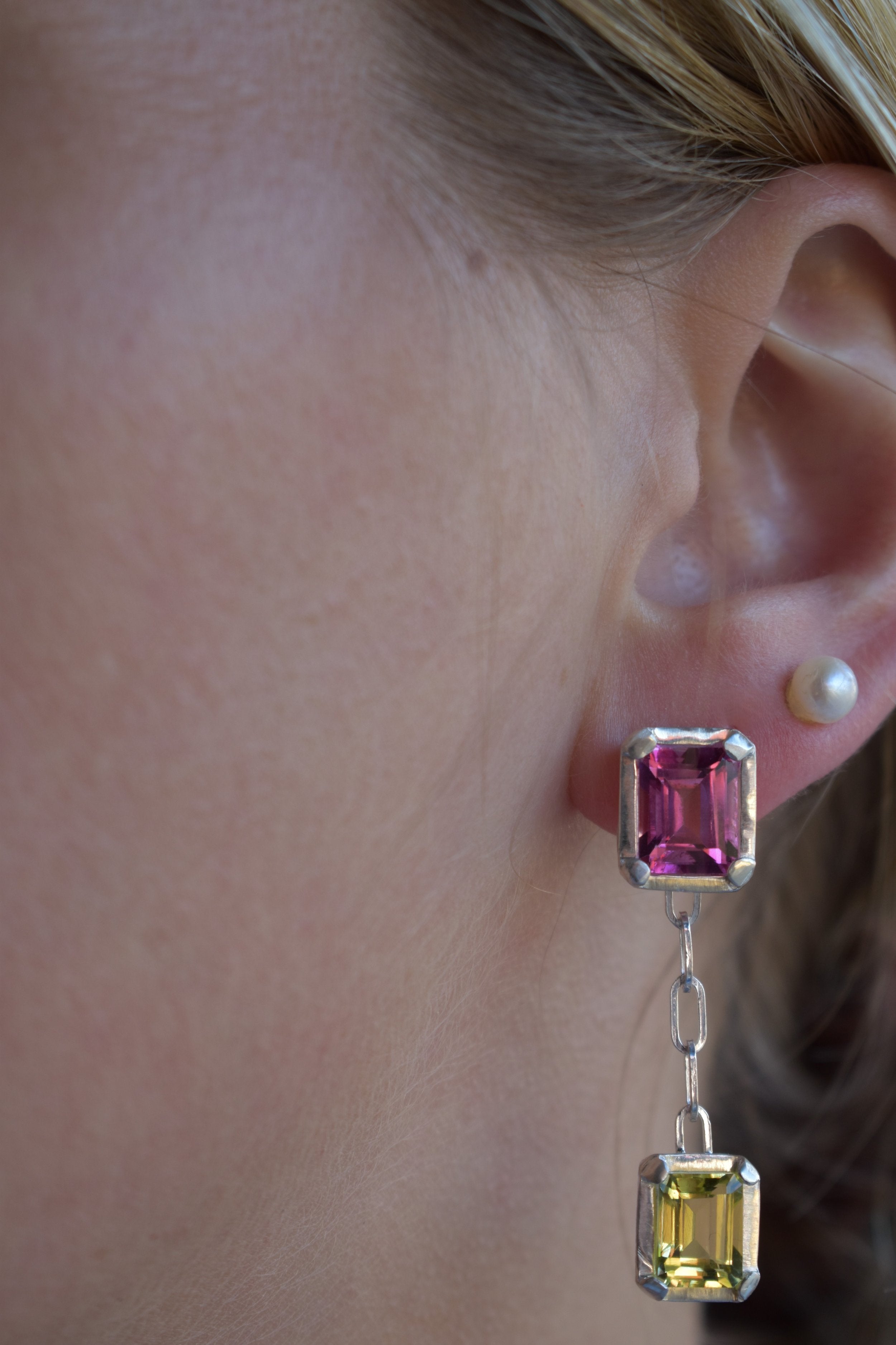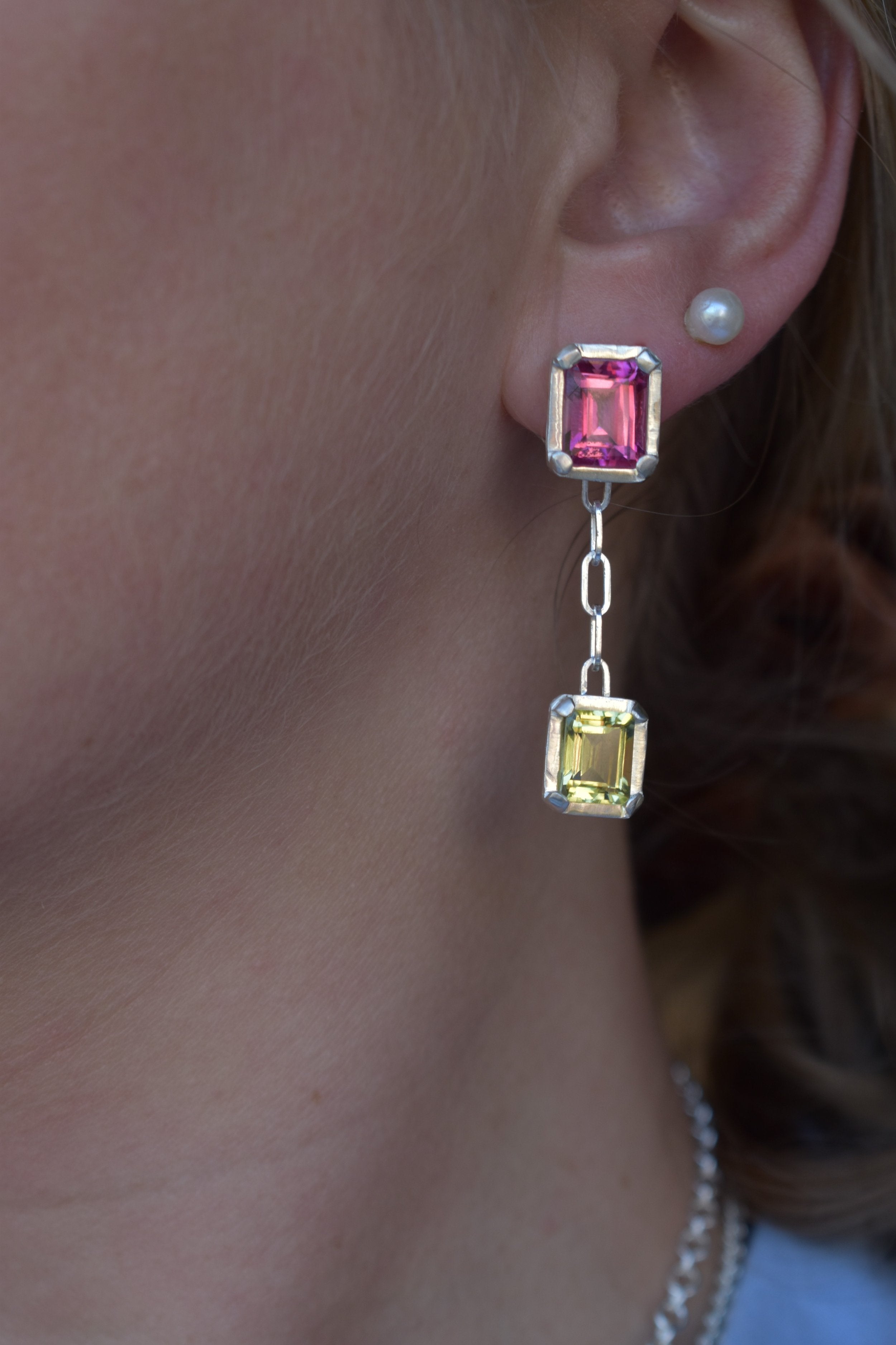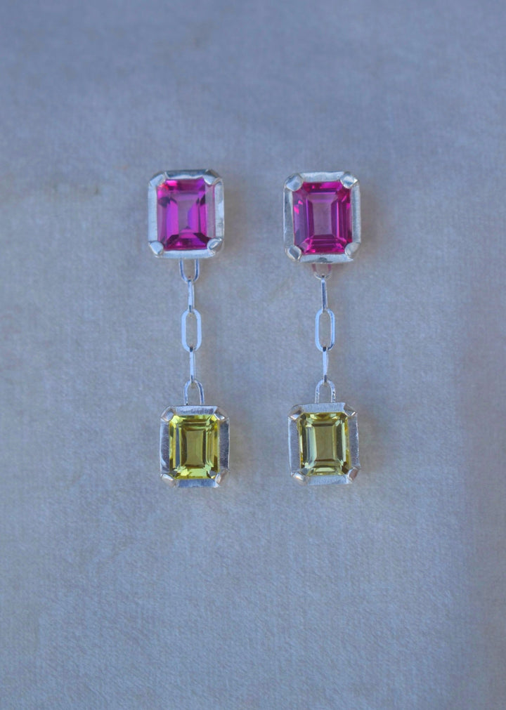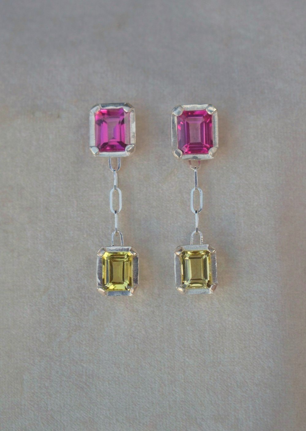 emerald octagon cut pink topaz and lemon quartz on silver setting.