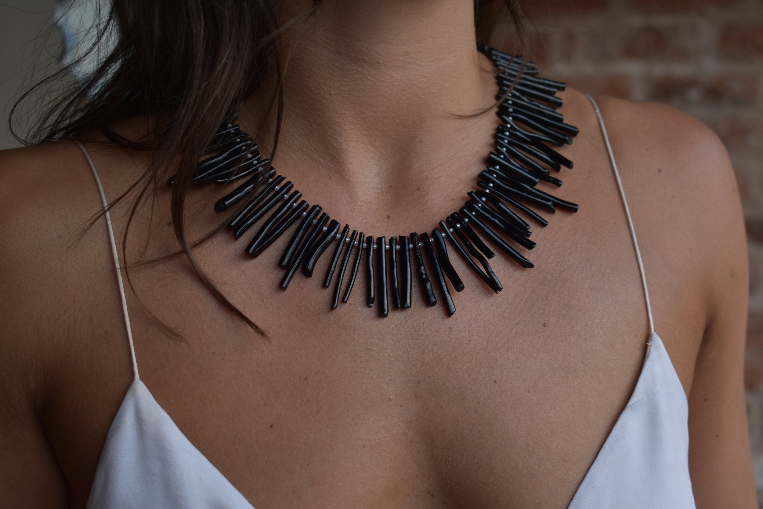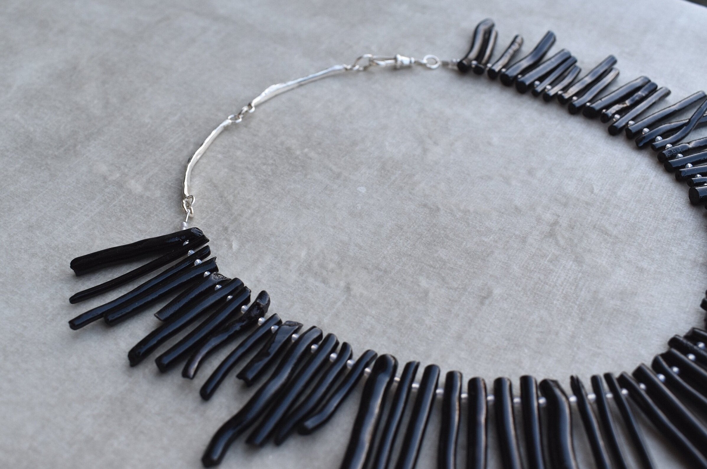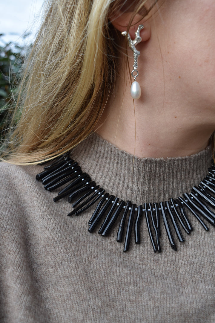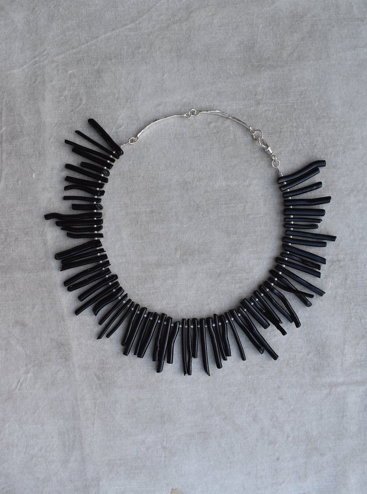 black coral pieces hand strung with a silver clasp.