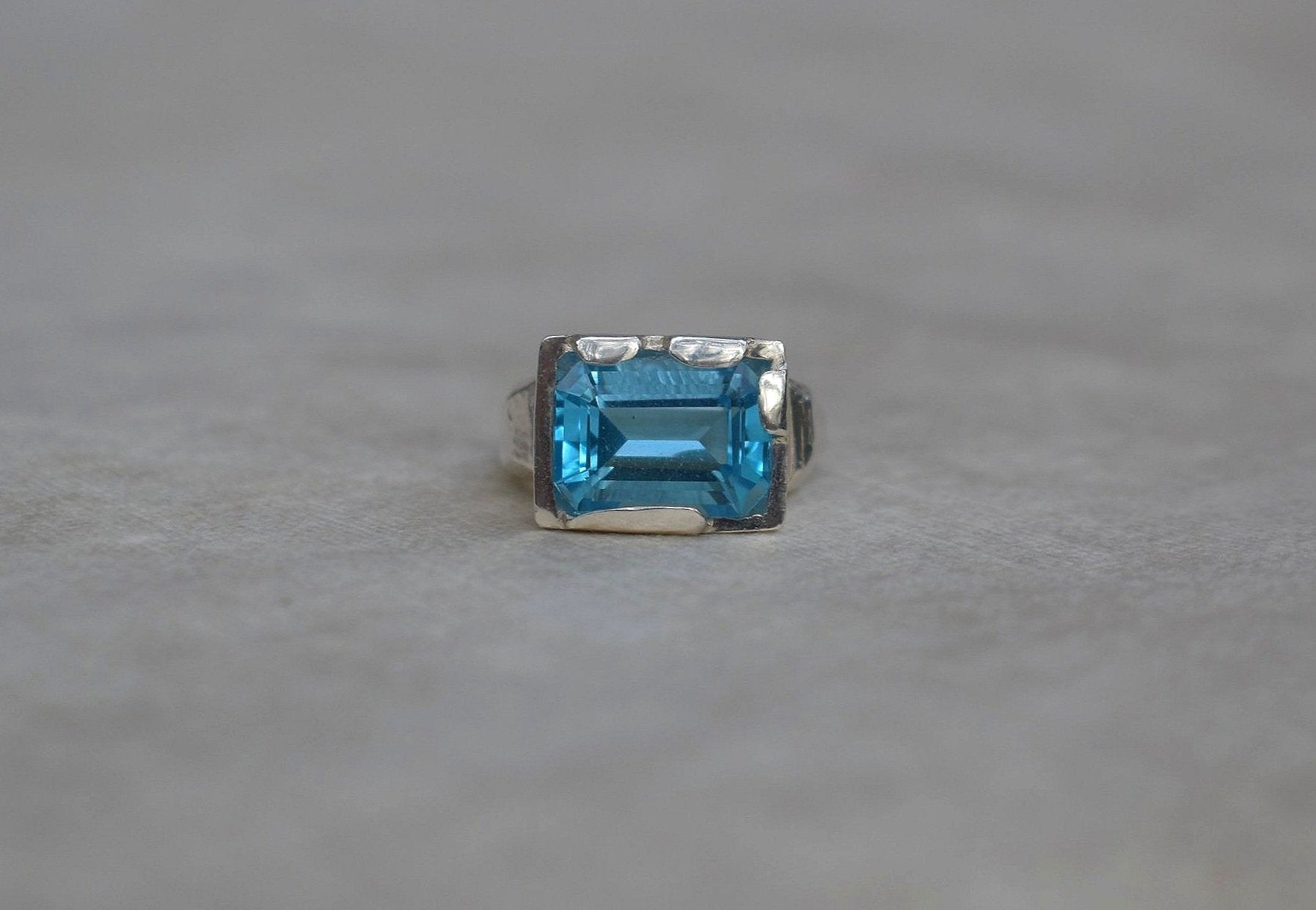 This is a beautiful emerald cut blue topaz set into a hand made solid silver setting.