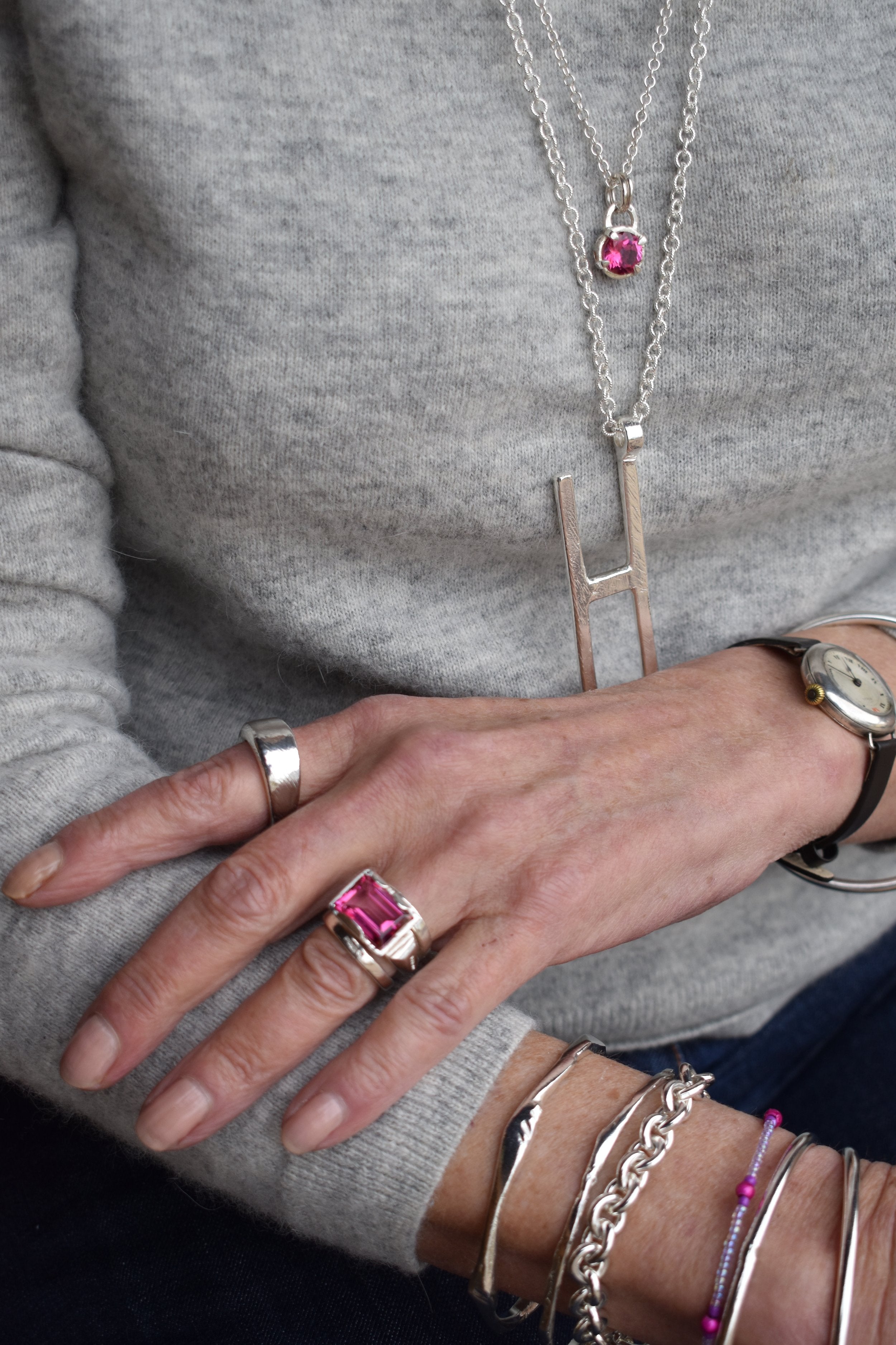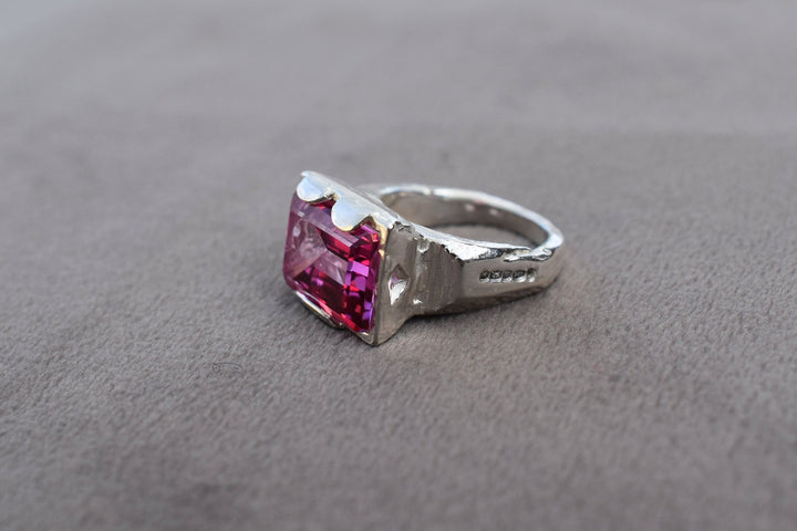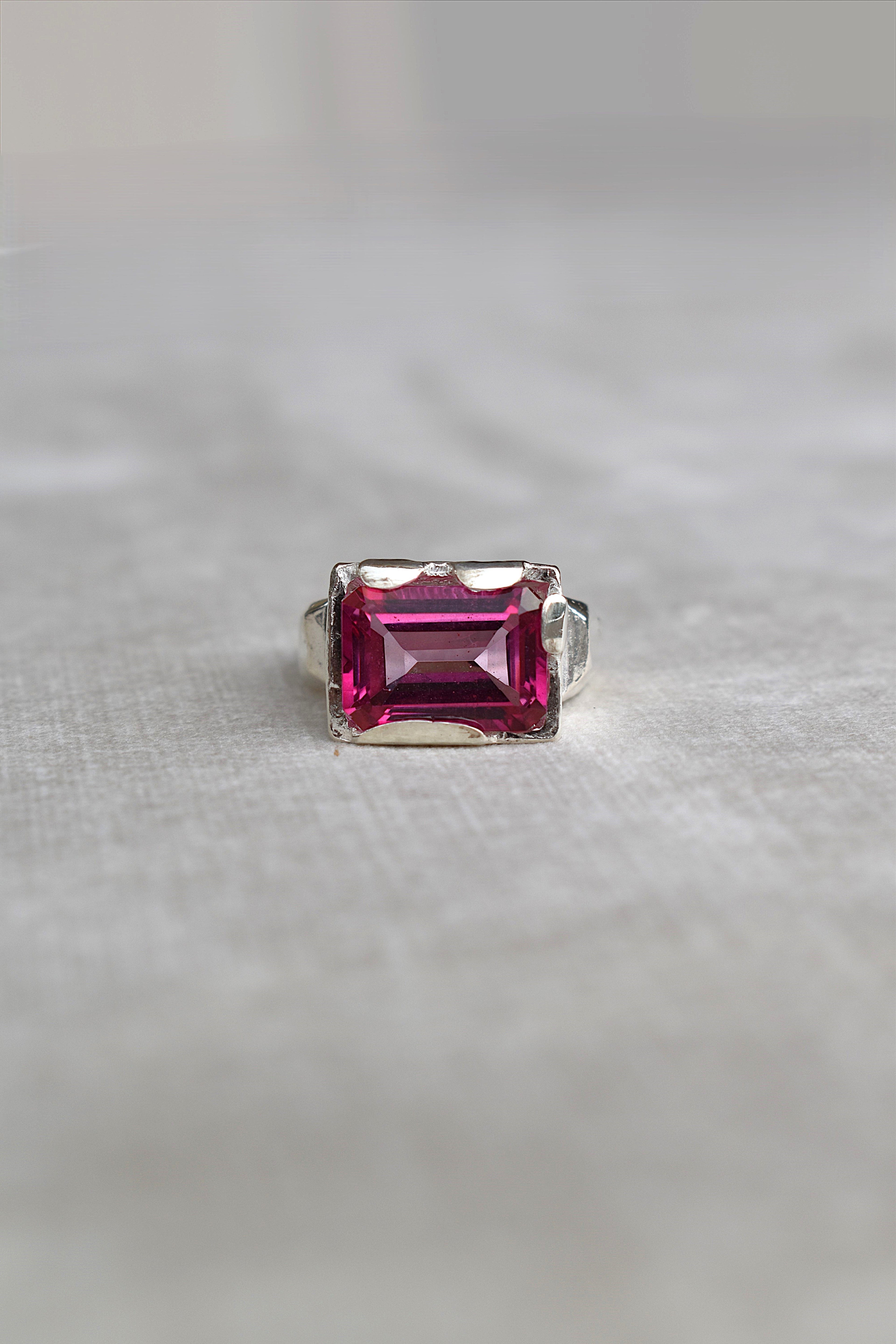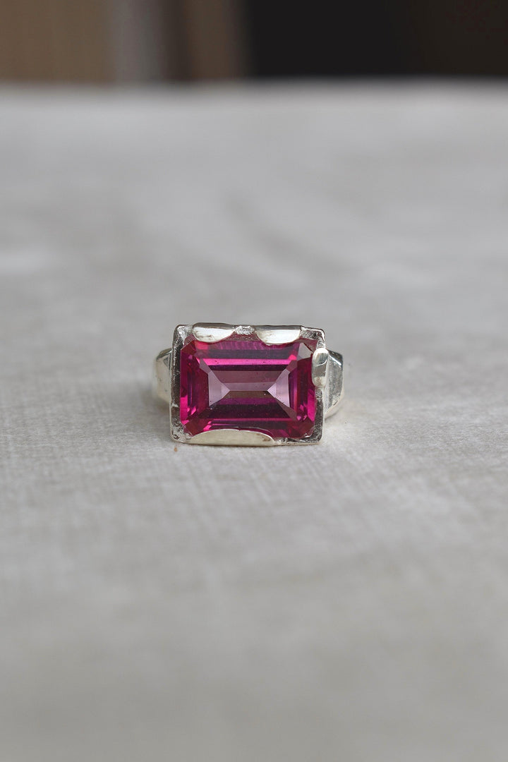 This is a beautiful emerald cut pink coated topaz set into a hand made solid silver setting. This ring is designed with a thick rectangular band.