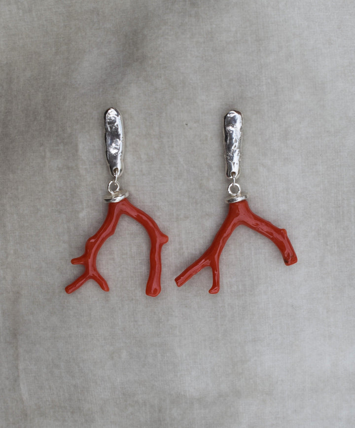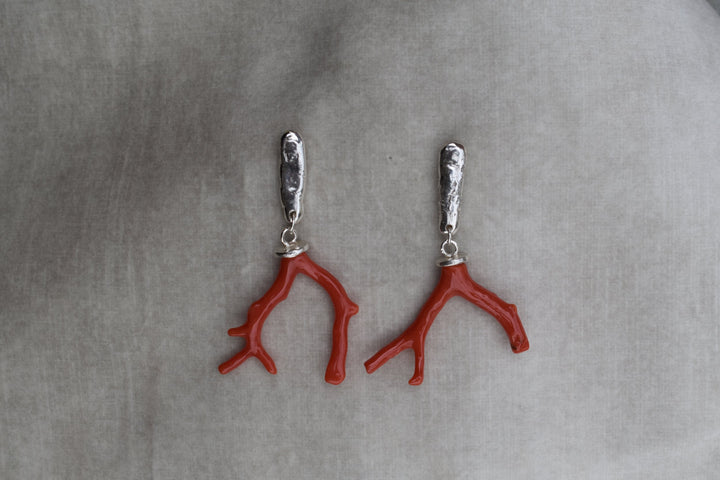 Hand carved silver earring with red ethically sourced coral bead. Each piece of coral is unique.