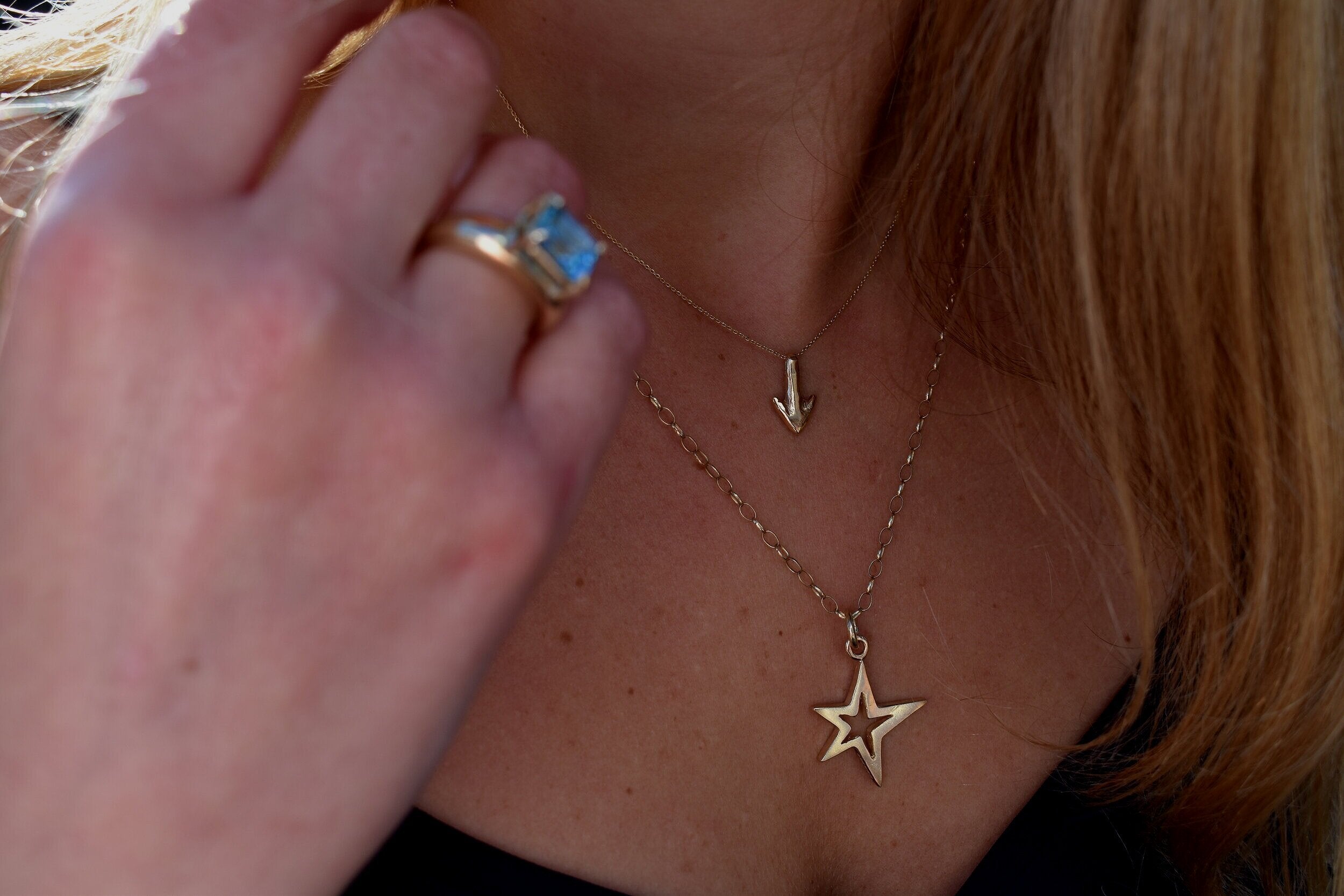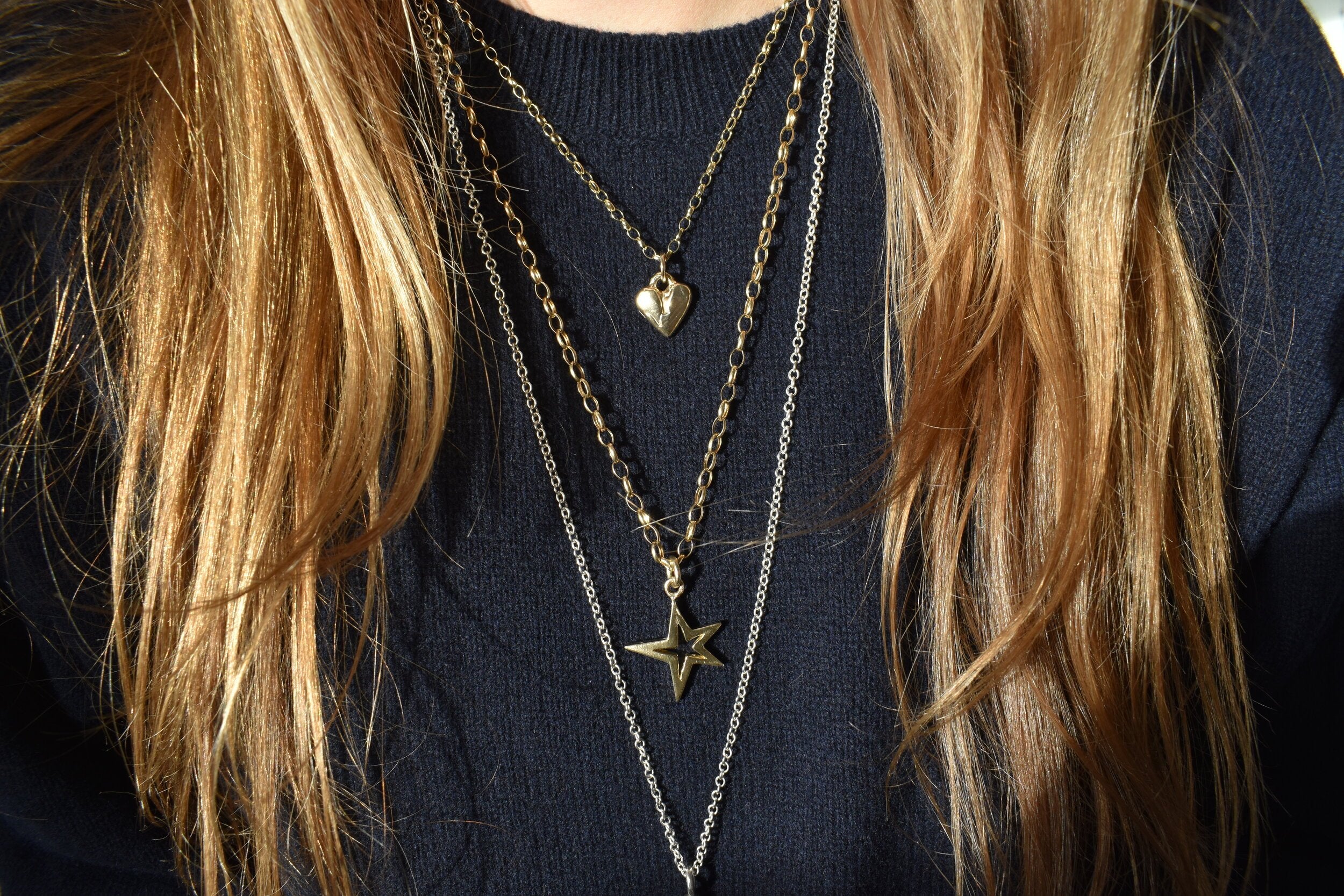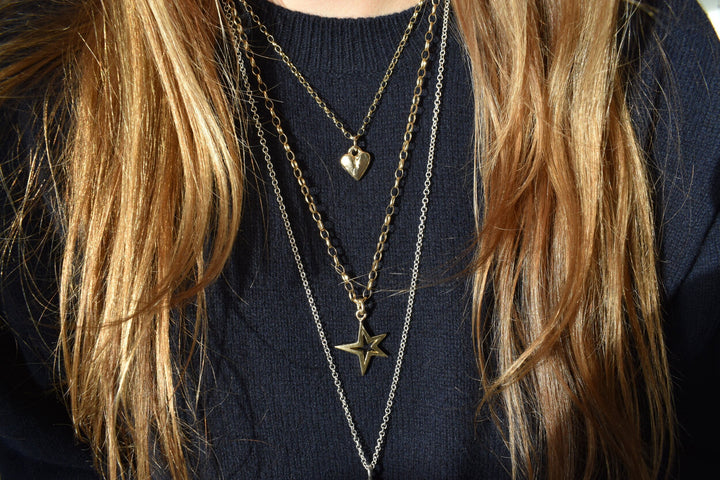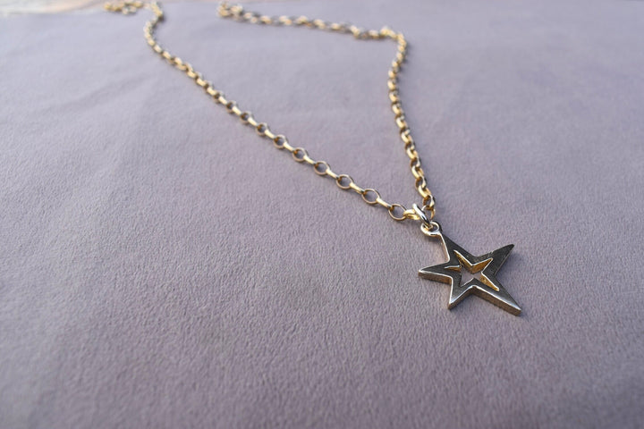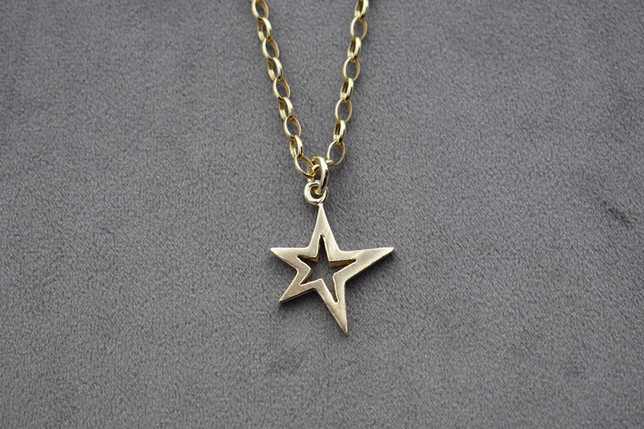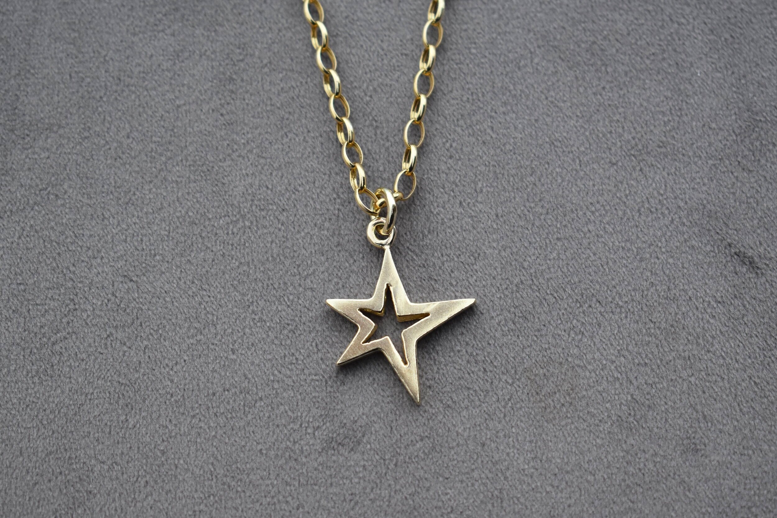 9ct gold hand carved star charm on a gold oval belcher chain. Hallmarked for gold and stamped with individual maker’s mark.