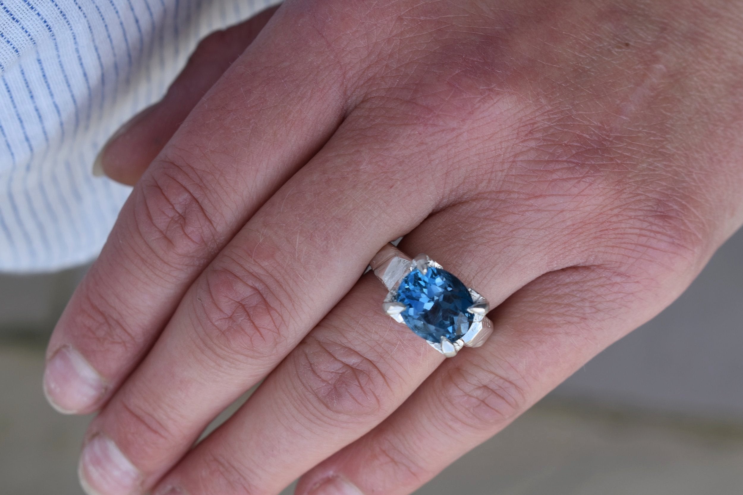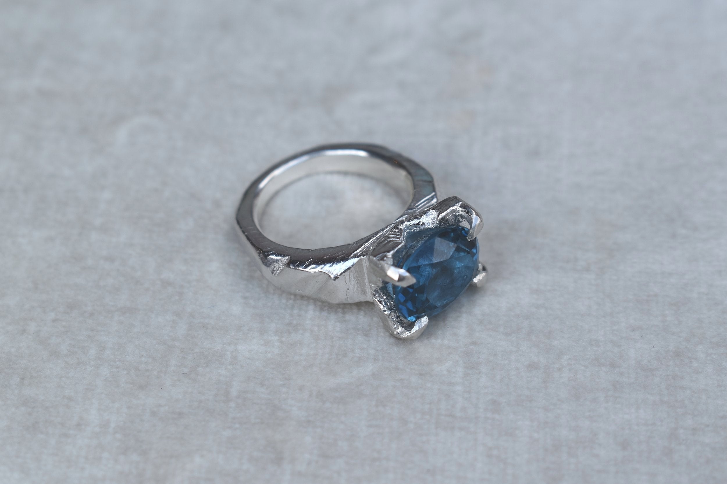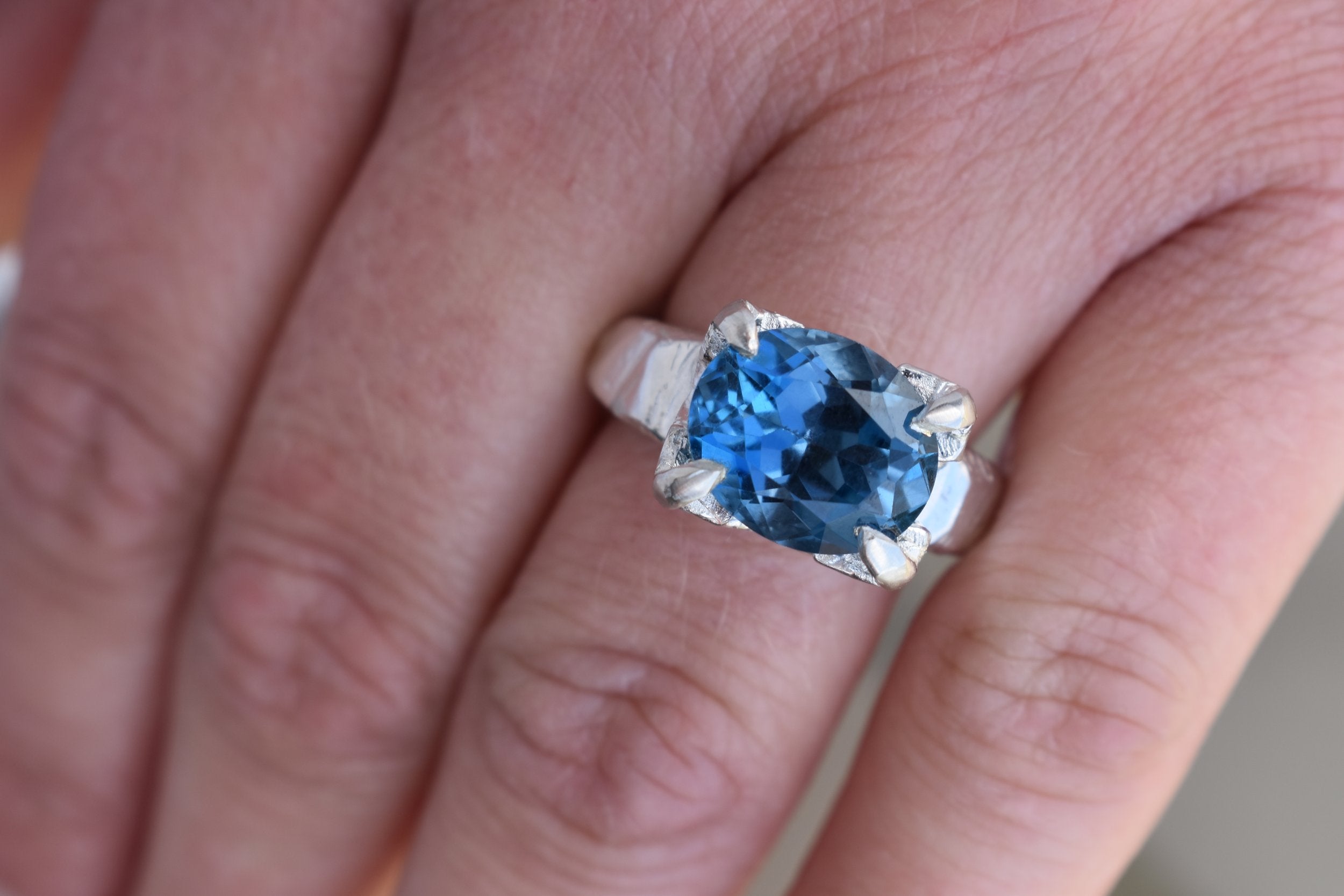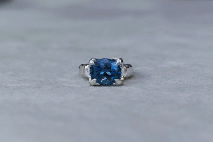 A beautiful, oval cut london blue topaz stone set in a silver claw setting. This is a rare london blue topaz gemstone