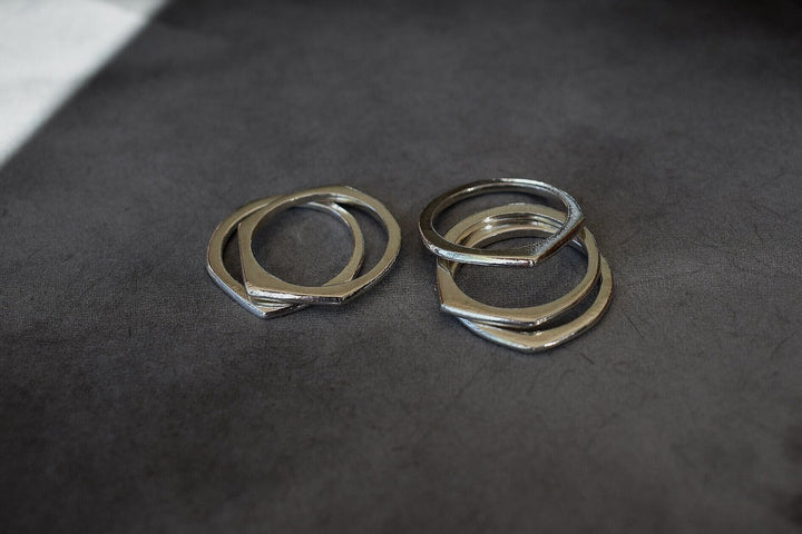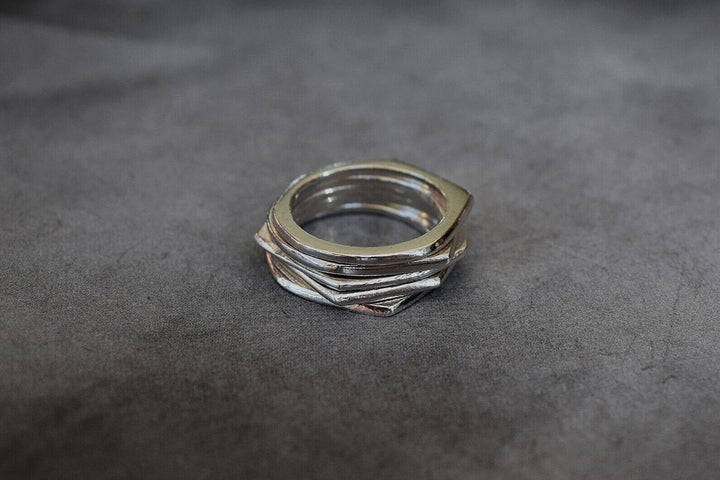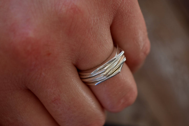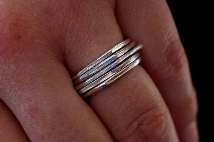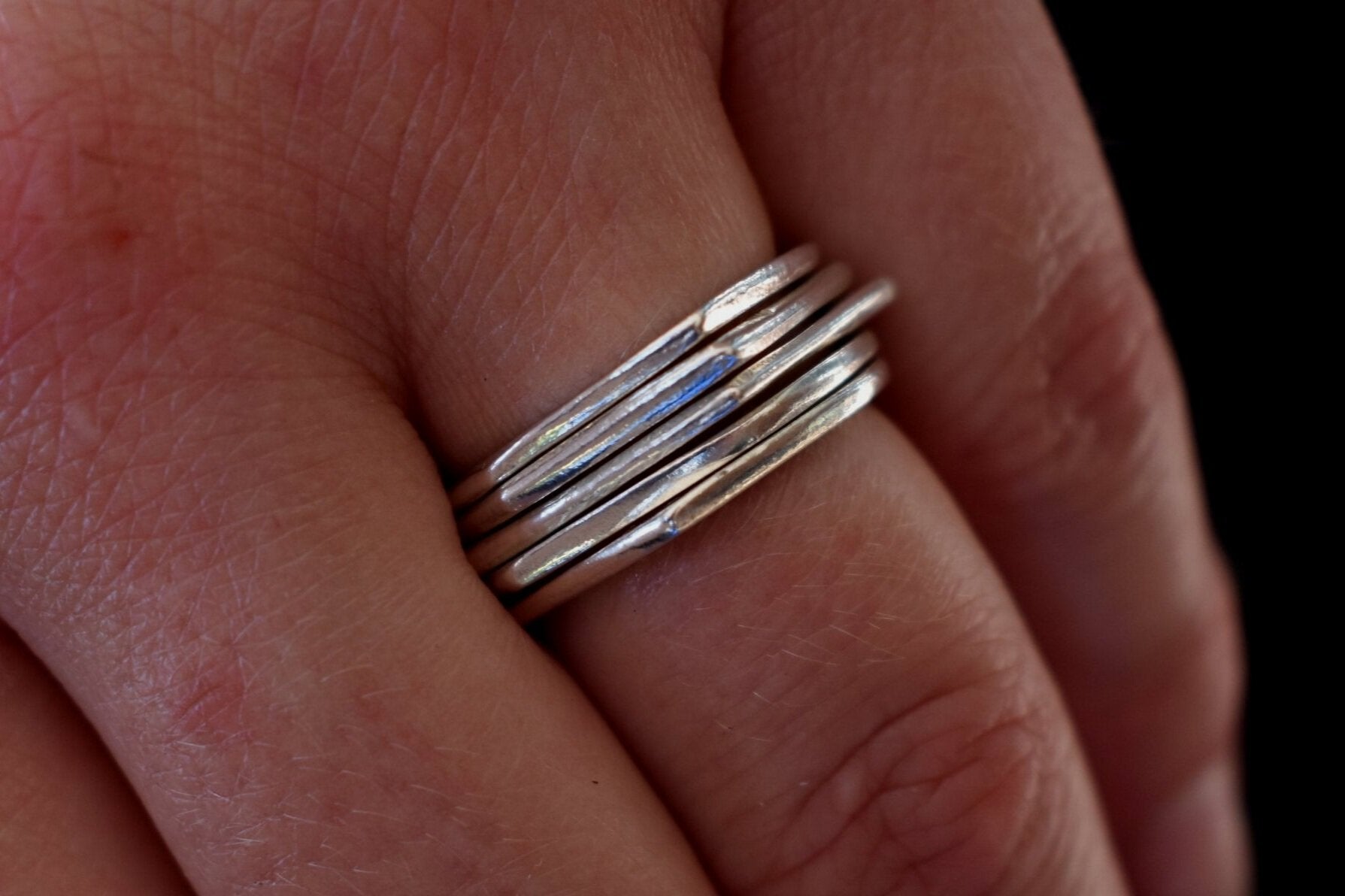 5 hand carved singlet rings in silver, freely stacked together to create a thick band. This item is sold as 5 rings together. Available to order in custom sizes.