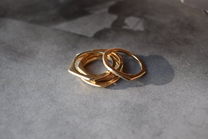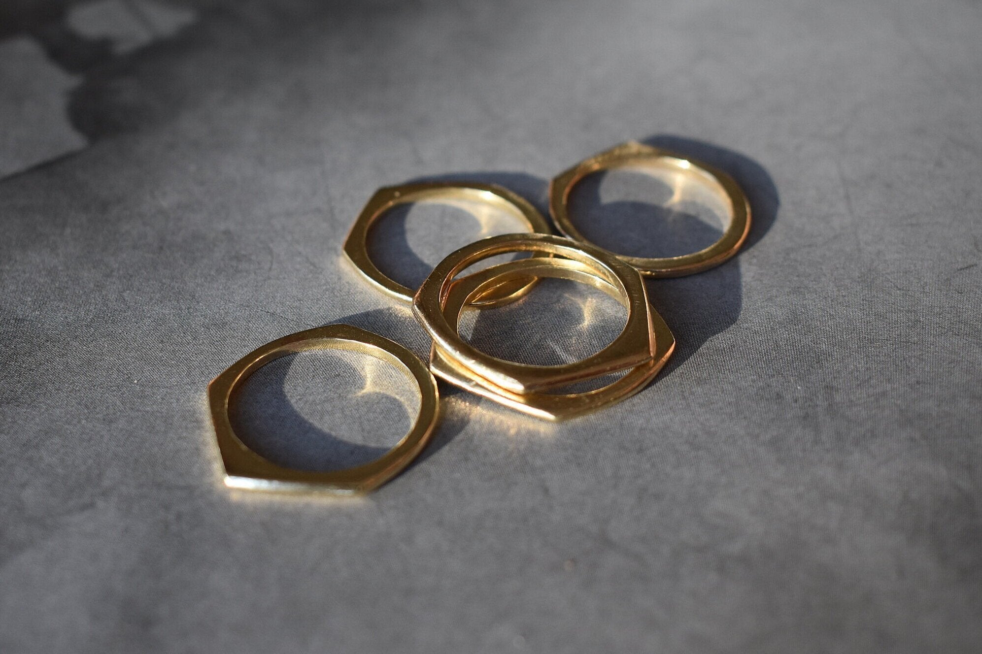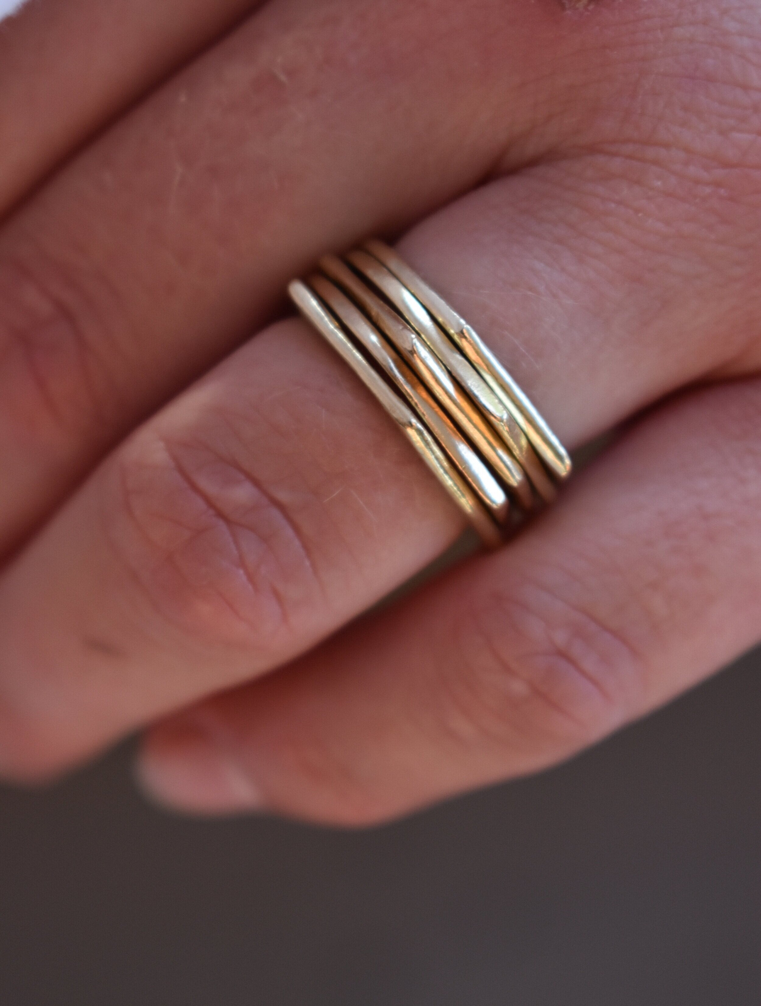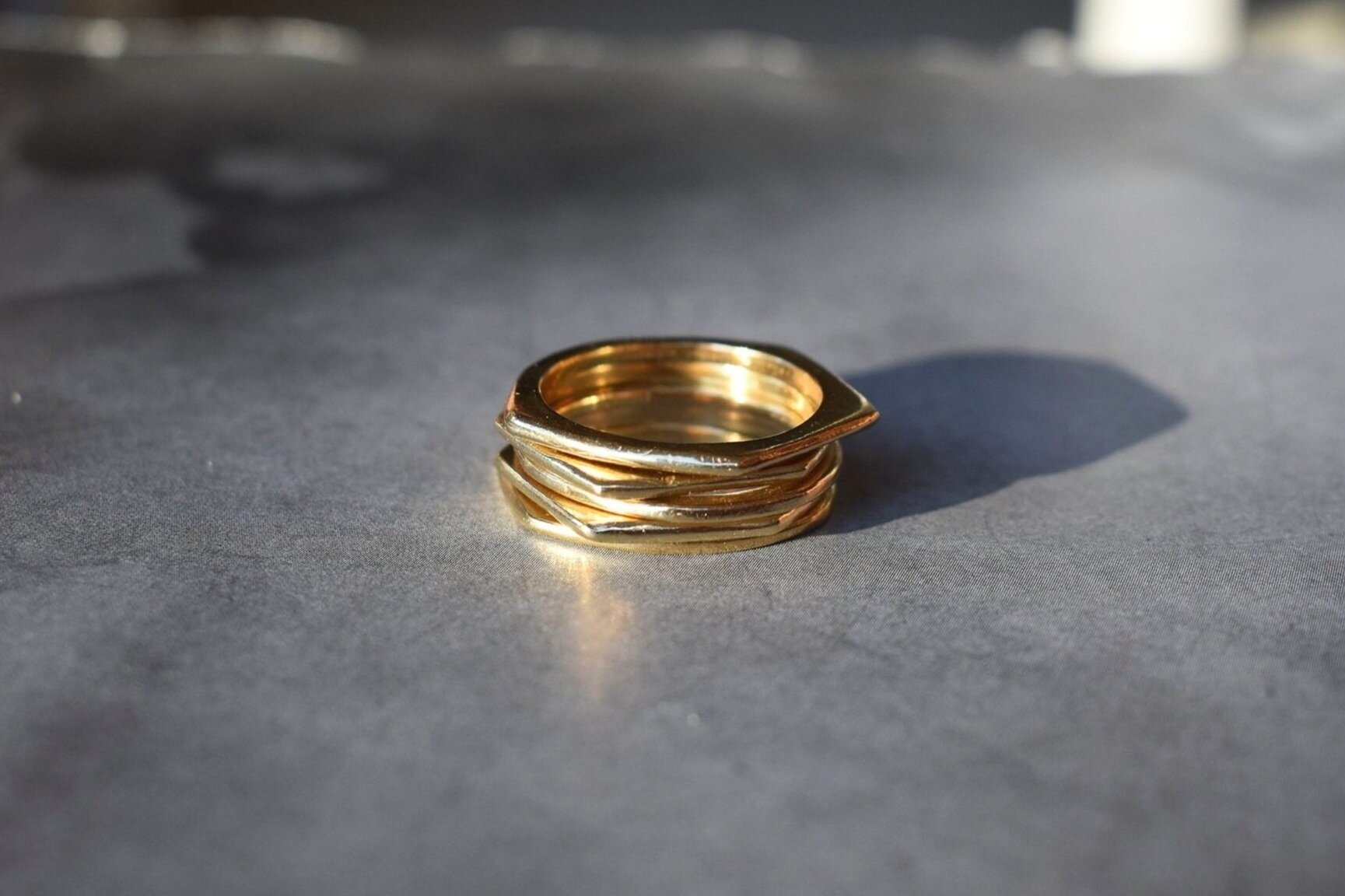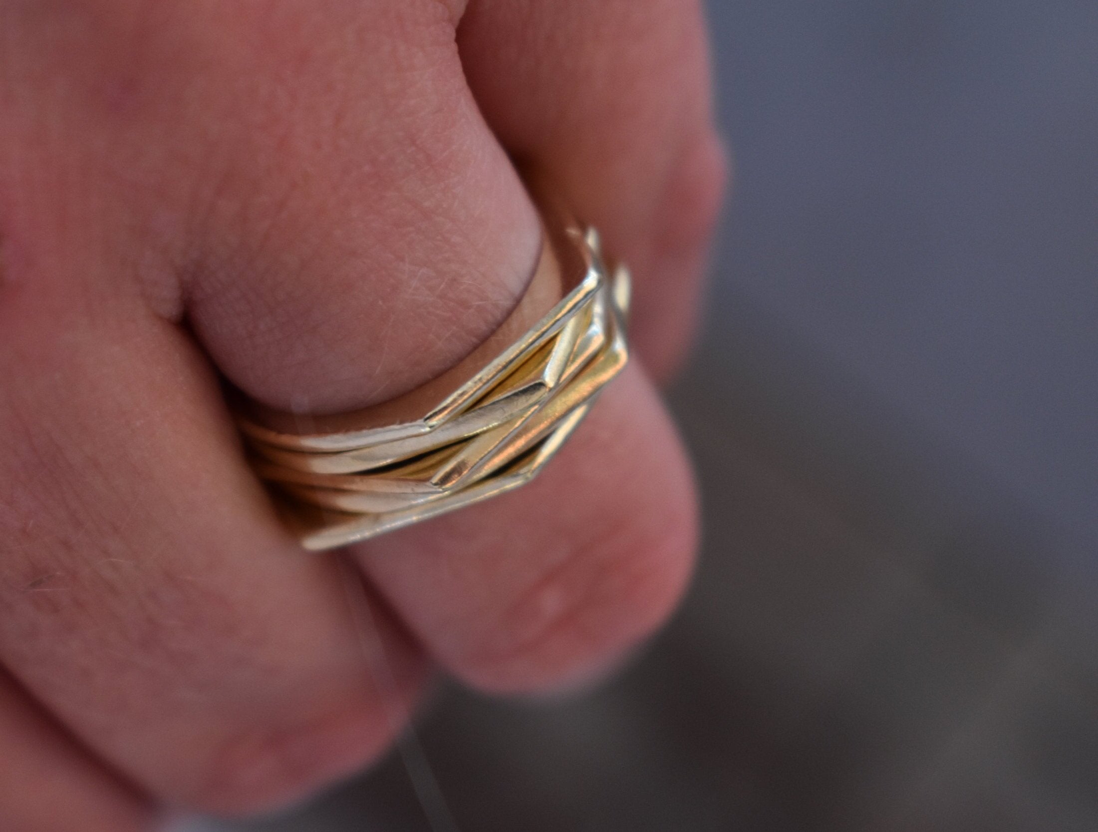5 hand carved singlet rings in gold, freely stacked together to create a thick band. This item is sold as 5 rings together.